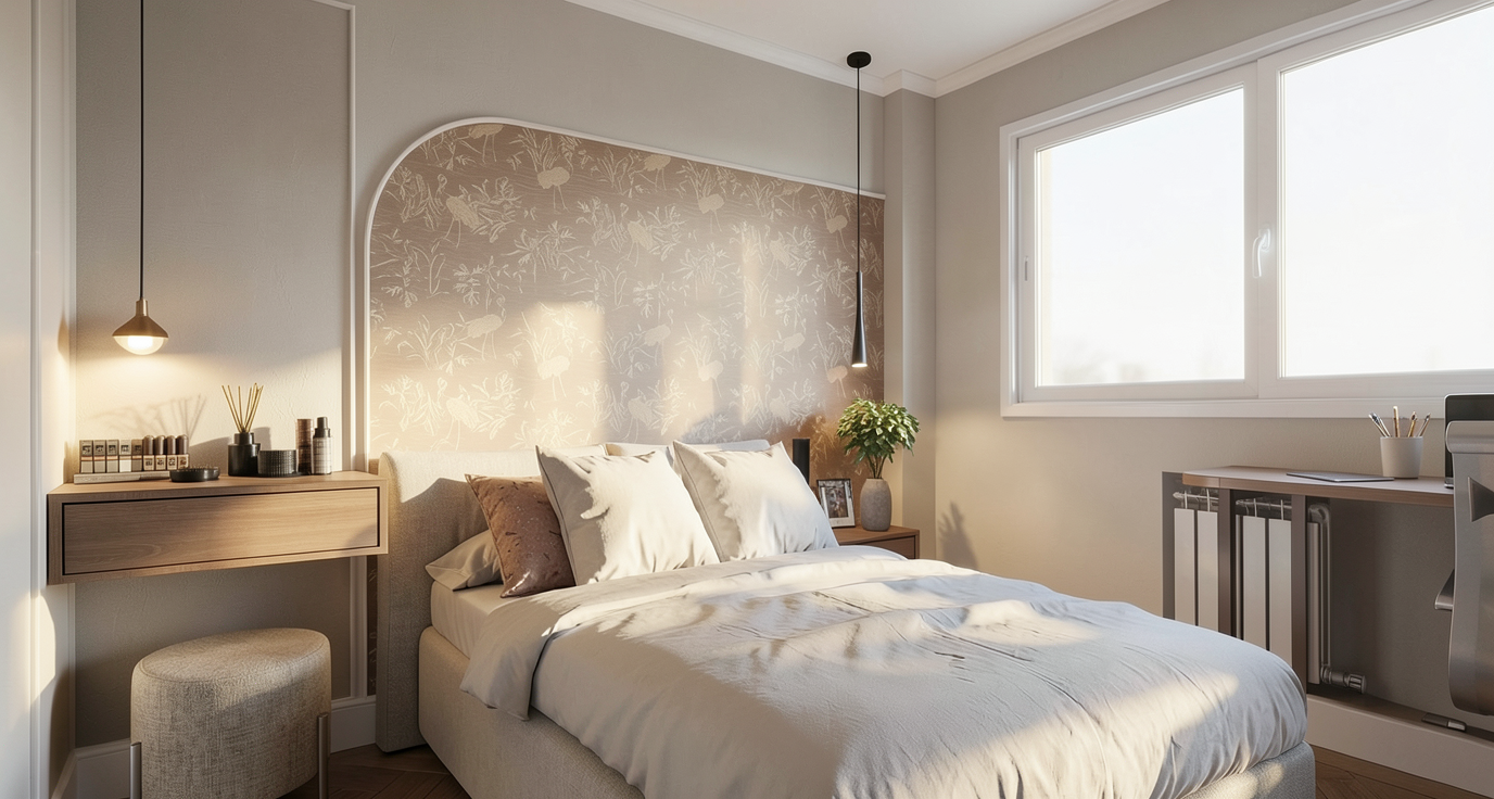 donde el mueble volado del tocador a la izquierda va un espejo hasta el techo qeu refleja la pared blanca de detras