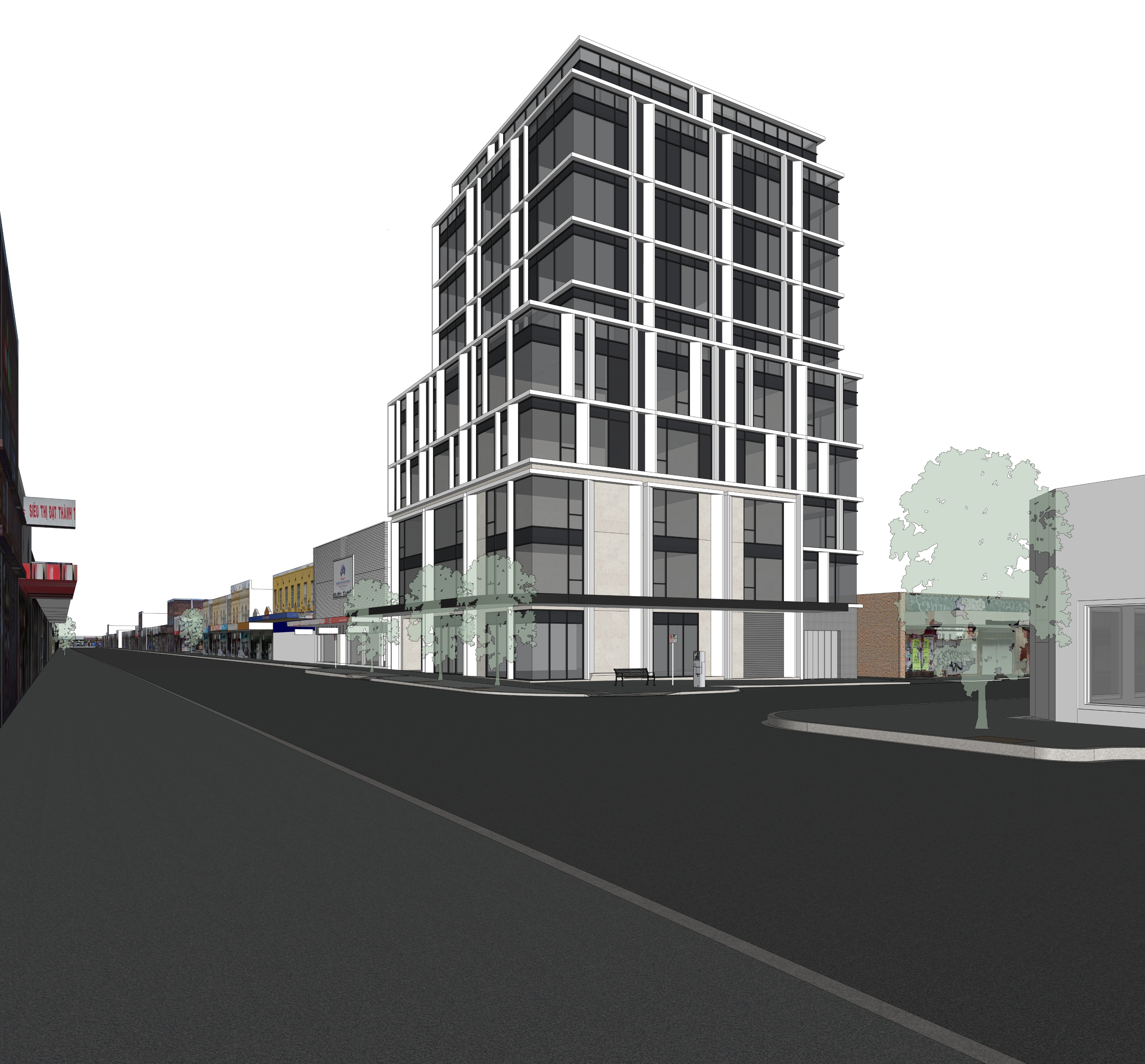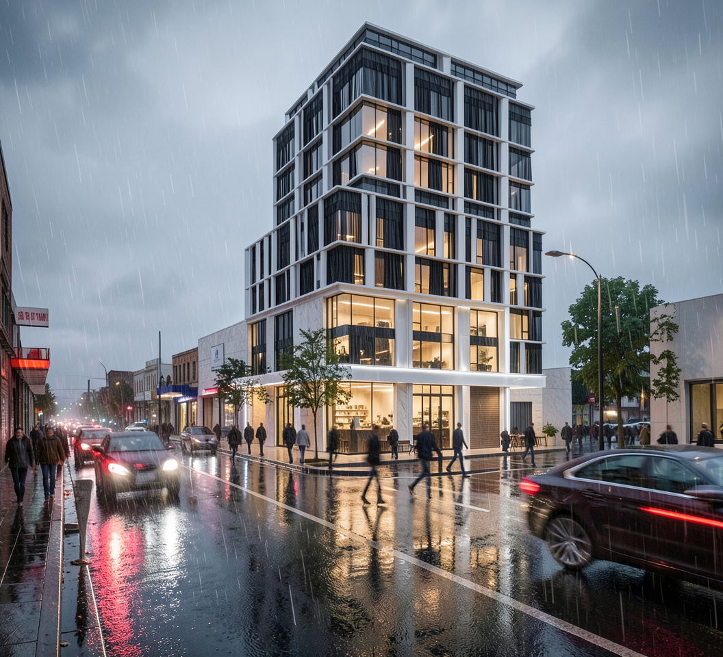 photorealistic canon eos 5d minimalistic coffee shop facede design black coloured curtain glazing on off white frame and white travertine clad facade panel walls geometric shaped outline archdaily style expert ultra realistic many details dramatic lighting lighting effects motion blurring walking award winning wet road car tail lightings