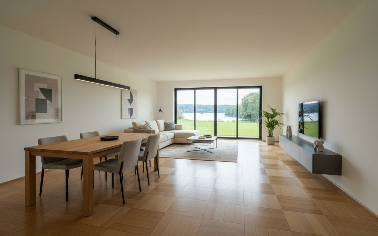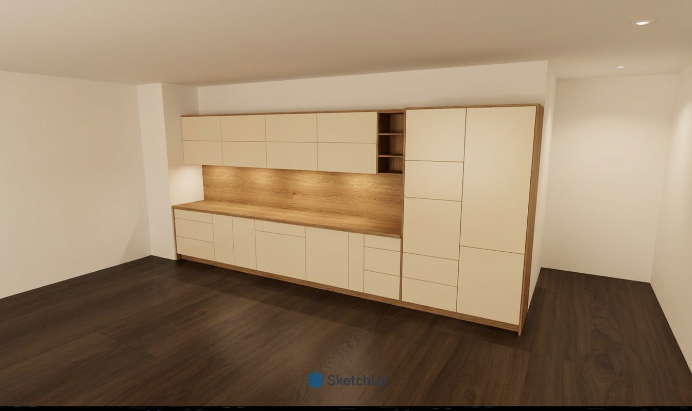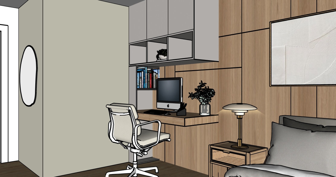 create a beautifully rendered modern bedroom with a cozy elegant atmosphere use warm neutral tones and soft lighting the bed is dressed with plush beige and white bedding walls are light beige adding warmth with a oak wood accent wall to enhance sophistication the desk is a polished wood with a sleek black computer complementing the modern white office chair shelves are white with subtle decor and books are vibrant to add color add a soft glow from a stylish desk lamp and a modern ceiling fixture the floor is rich light wood contributing to a tranquil environment enhance with soft shadows and natural lighting for a serene ambiance light on the cabinets
