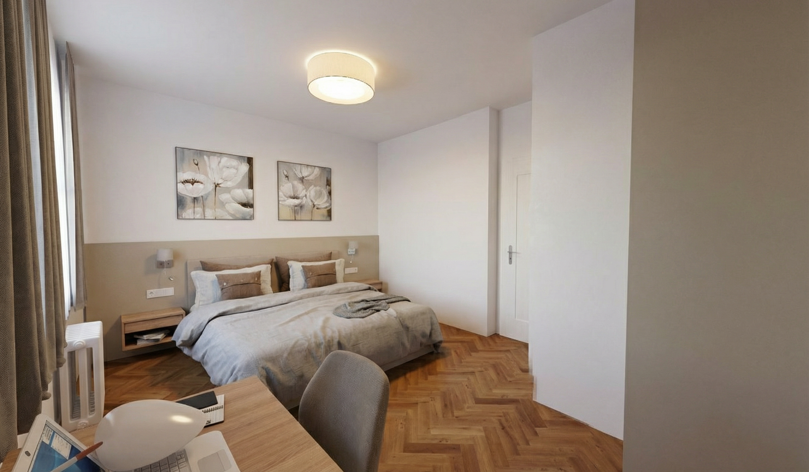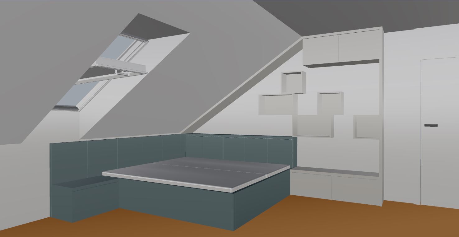 create a photorealistic render of a children s bedroom the furniture has light beige solid parts in egger u707 st9 decor the slanted panel running from the bed up to the upper cabinets is also finished in egger u707 st9 decor the dark green parts of the furniture are upholstered with a soft fine textile texture in a petrol deep teal green shade all upholstered elements should look soft comfortable and padded the bed contains two mattresses the bed is dressed with a bedsheet pillow and duvet styled in a casually made relaxed way place toys for a small boy on the shelves toy cars and children s books on the bedside table add a modern minimalist lamp the floor is a natural oak wood finish the scene is bright and airy with daytime natural sunlight creating a warm and calm atmosphere style ultra realistic high detail soft natural lighting clean contemporary interior design realistic materials and textures the shelf design must stay exactly as shown in the reference image without any shape or proportion changes the beige furniture finish must be lighter and slightly more grey toned exactly matching the egger u707 decor