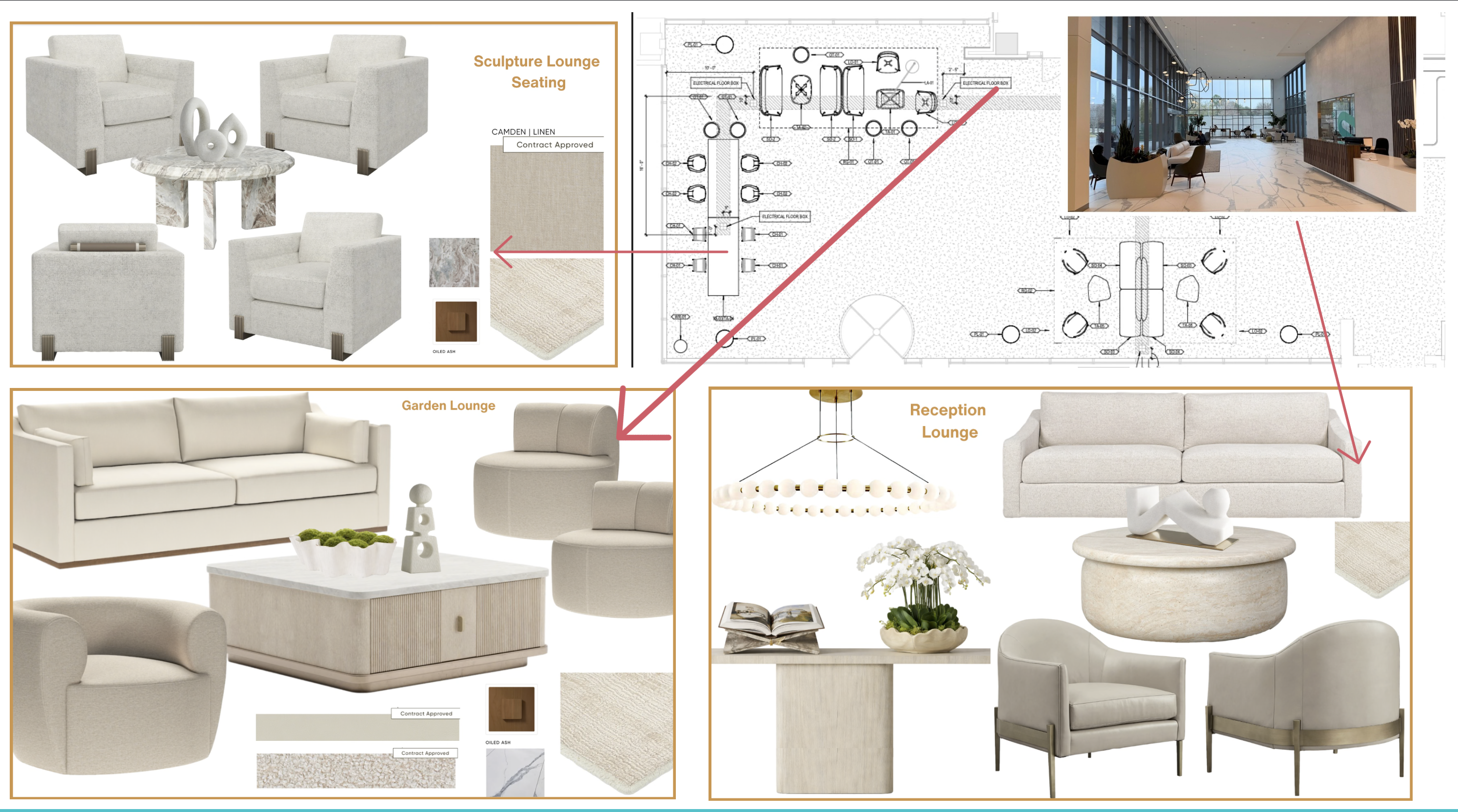 transform this office lobby into a photorealistic hospitality inspired space with three distinct lounge areas using the furniture exactly as shown in the provided lookbook references lounge area 1 at the far end along the 38 foot wide floor to ceiling windows place four matching lounge chairs from the lookbook arranged as two chairs facing two chairs with a centered coffee table from the lookbook maintain generous spacing so the outdoor garden sculpture is clearly visible between the two chair groupings lounge area 2 immediately to the right of lounge 1 against the window wall place one lookbook sofa facing the garden with four matching swivel bucket chairs from the lookbook two on each side surrounding a 48 x 48 square cocktail table from the lookbook preserve clear circulation and exterior views lounge area 3 directly across from the reception desk place two matching sofas from the lookbook back to back with a 78 inch wide console table between them in front of each sofa add a round marble cocktail table and two legged occasional chairs exactly as shown in the lookbook reference image overall style soft neutral palette warm whites creams taupes light wood stone brushed metal accents hospitality grade construction realistic daylight accurate scale clean architectural lighting photorealistic materials and shadows