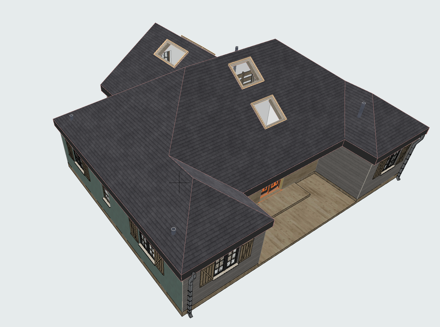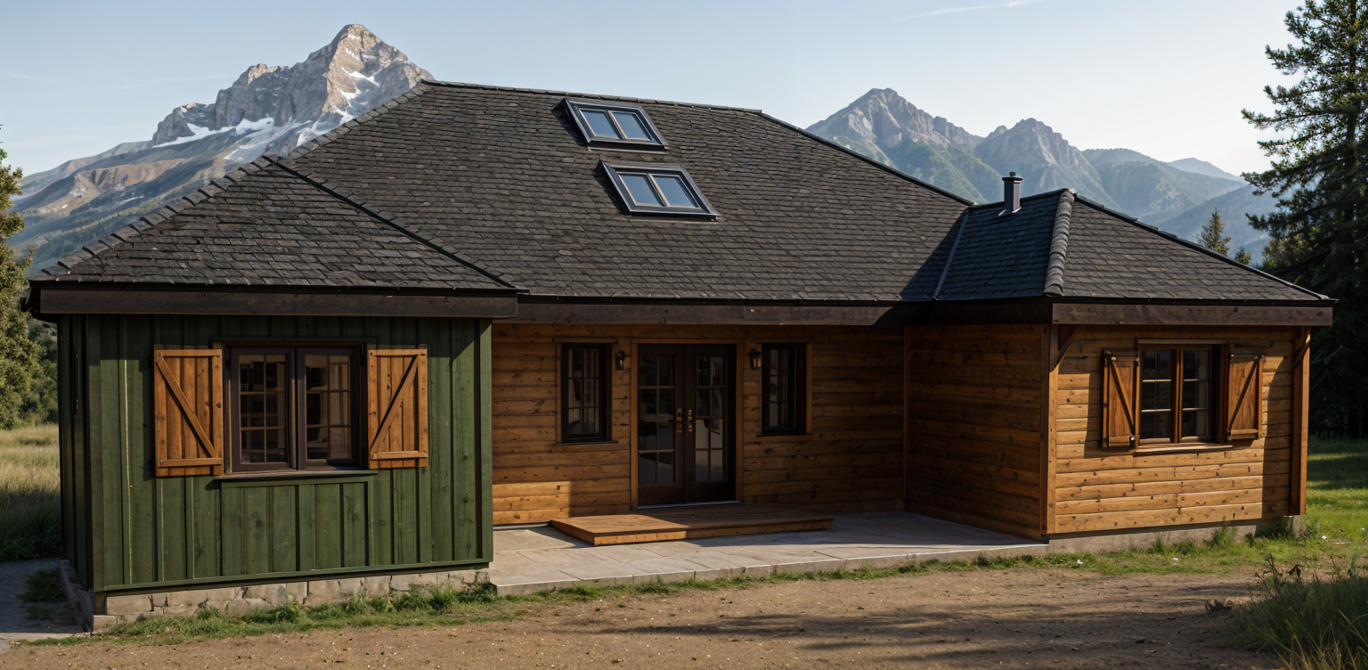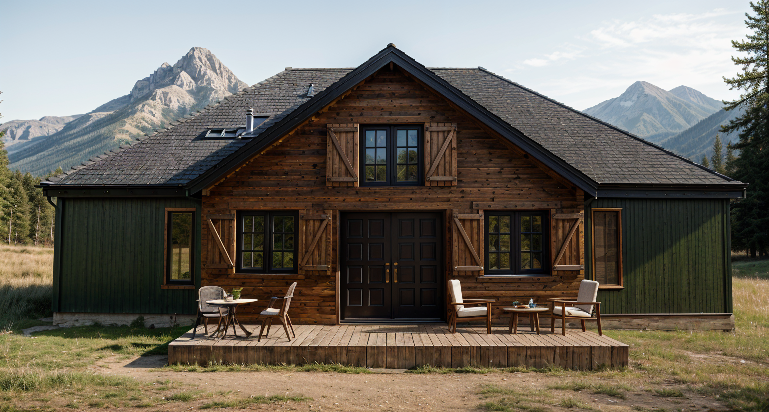 shingle roof walls in green to be vertical green metal walls in wood to be clear wood land scape mountains and trees