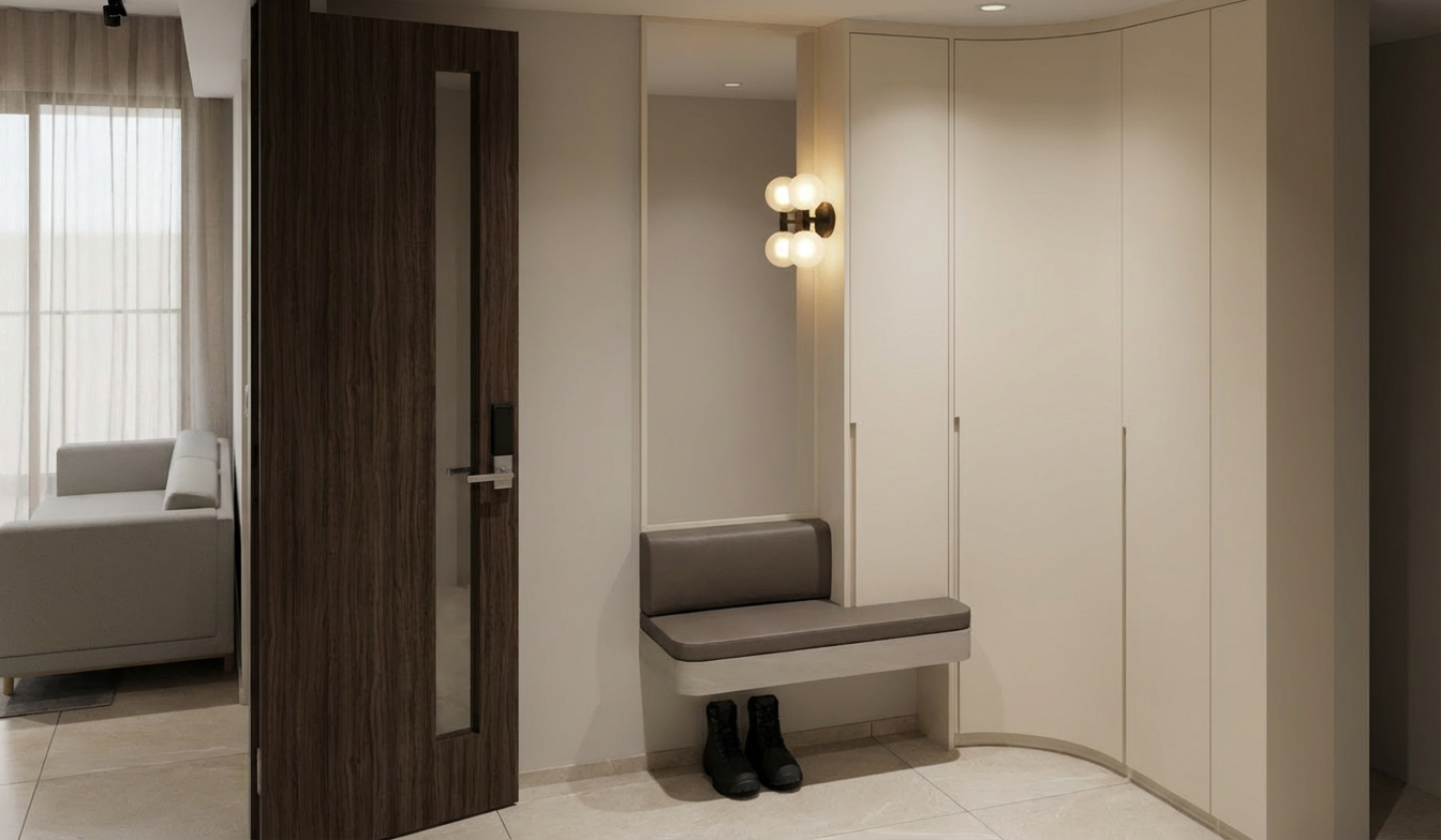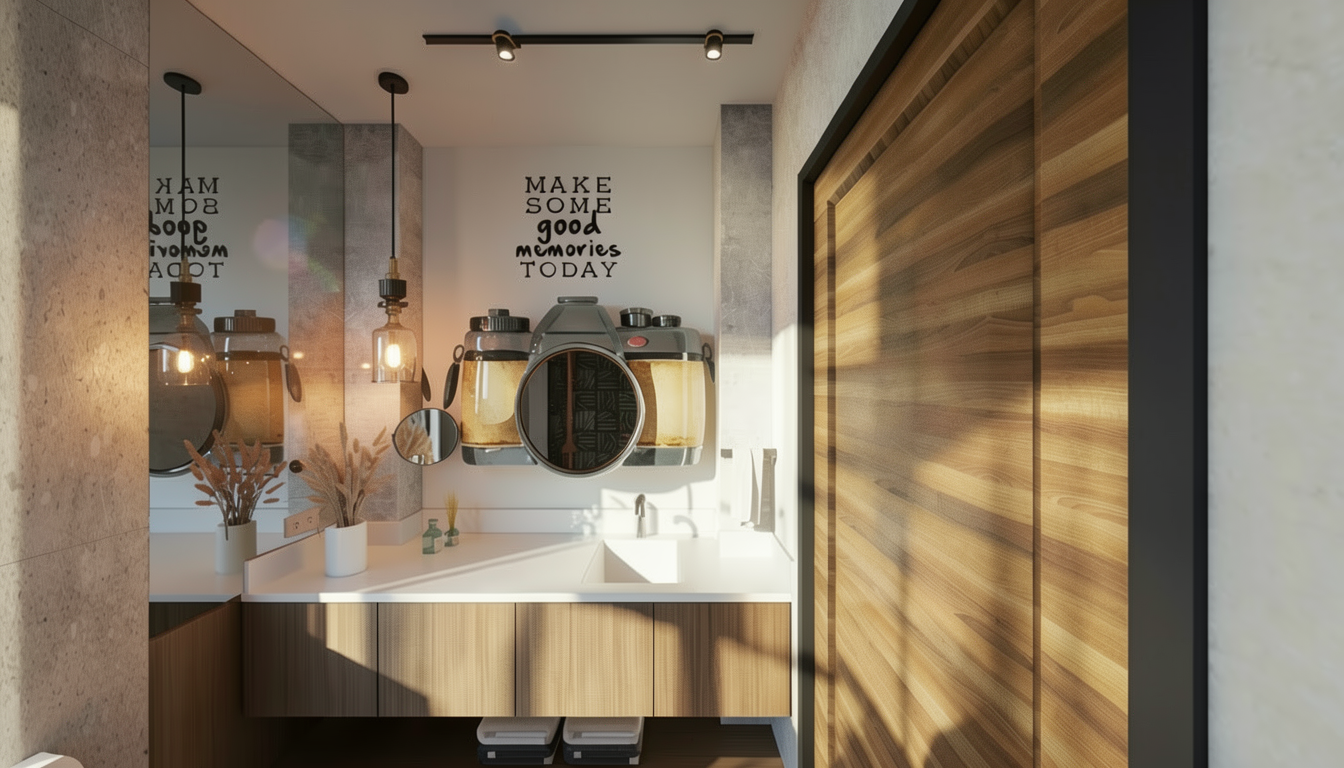 make this rendering into a real photo preserve the material colors patterns scale and dimensions add a small oval fluffy dark red rug in front of the tub add a towel hook in polished nickel to the wall behind the tub and hang a red silk robe on the right side on it make the tub filler in a polished nickel finish the sliding doors should be a in a dark grain wood with raised panel door front add 2 recessed cans where the lights are add one more recessed can in the same size as the others above the shower add some trees and blue sky outside the window and include a sliding window in the frame add some red and black towels in a botanical pattern to the towel bar on both the top and bottom and have a basket under it and put some used towels in them also that have a patten make the art piece surrounded by a wooden frame