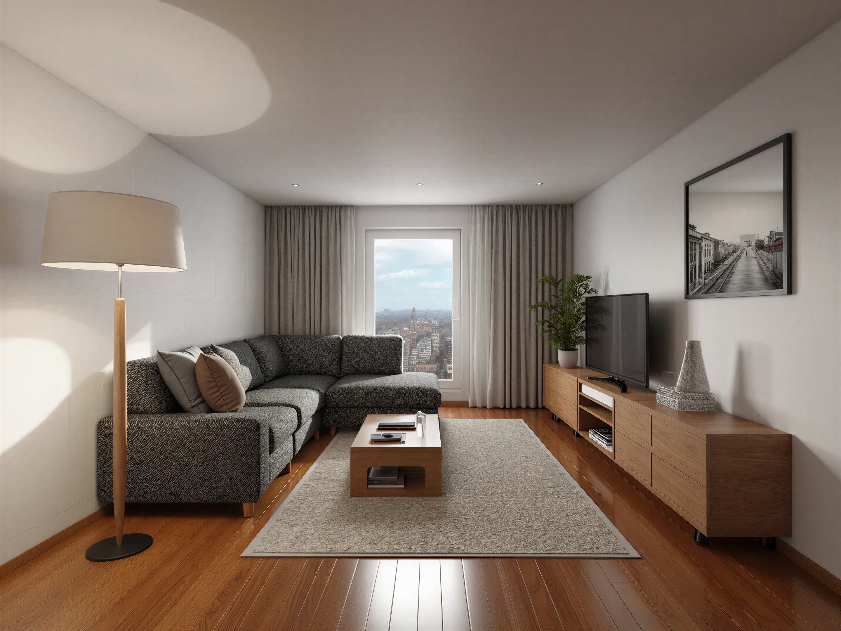 this photo shows a modern and sleek living room with a calm neutral color scheme the room features a large sectional sofa in dark gray complemented by a few throw pillows in front of the sofa there s a simple wooden coffee table on a soft beige rug adding warmth to the space the room is well lit by a tall minimalist floor lamp next to the sofa a television sits on a low wooden media unit with a few decorative items placed on top to the right a tall plant adds some greenery to the room a framed black and white photograph on the wall enhances the minimalist style the large window offers a scenic view of a cityscape with the soft light streaming in brightening the room and giving it a spacious airy feel the floor is made of polished wood which contrasts nicely with the light colored walls and furniture architecture