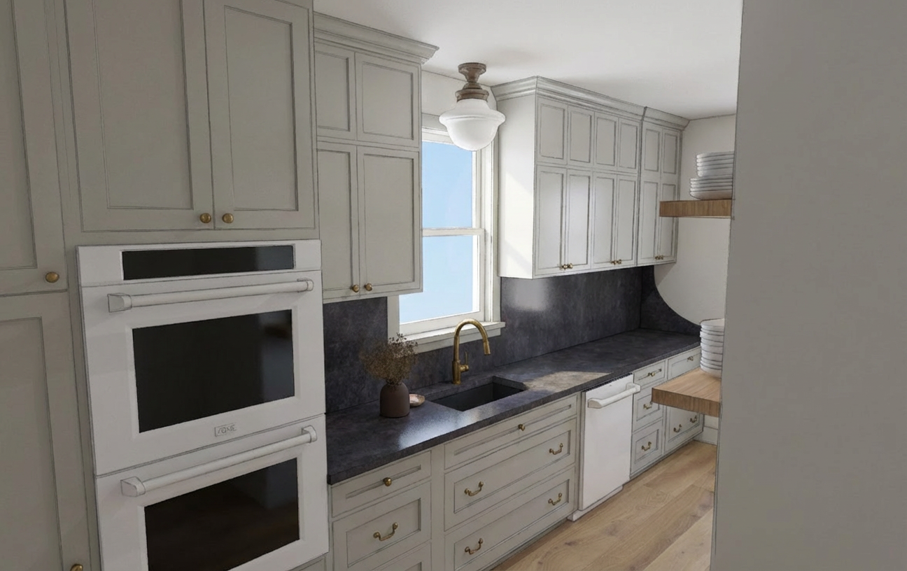 render this console more photorealistic the surround is brown leather the cabinet fronts are medium tone walnut and there are strips of taj mahal slab on each side do not add or change anything keep materials the same