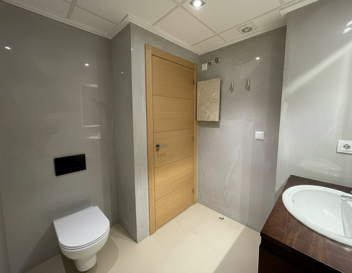 elimina el lavabo y el mueble en el que est encastrado pon en su lugar el mueble de microcemento de la imagen de referencia que debe llegar hasta la parte inferior de la imagen sobre el mueble coloca los lavabos de la imagen de referencia