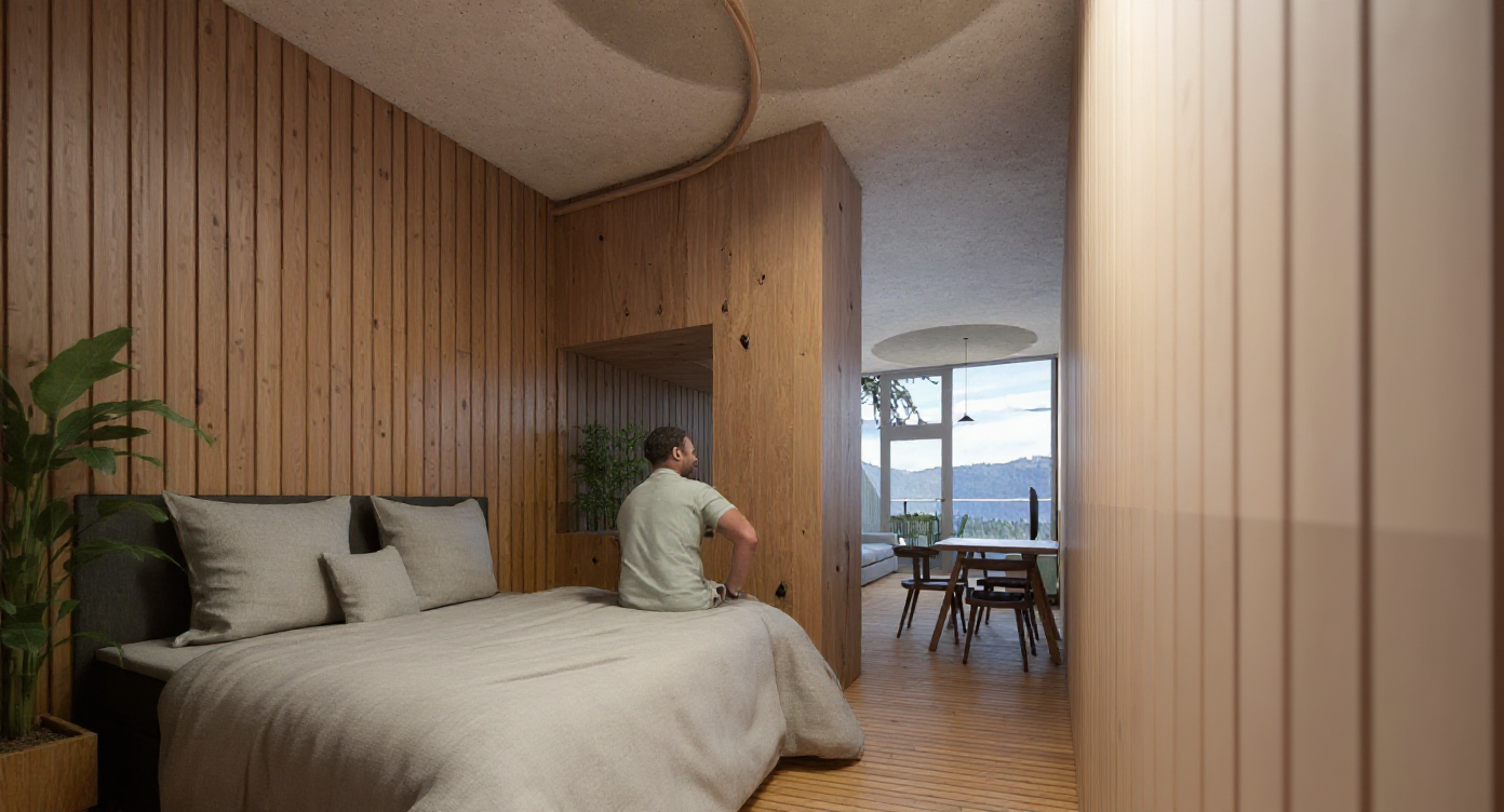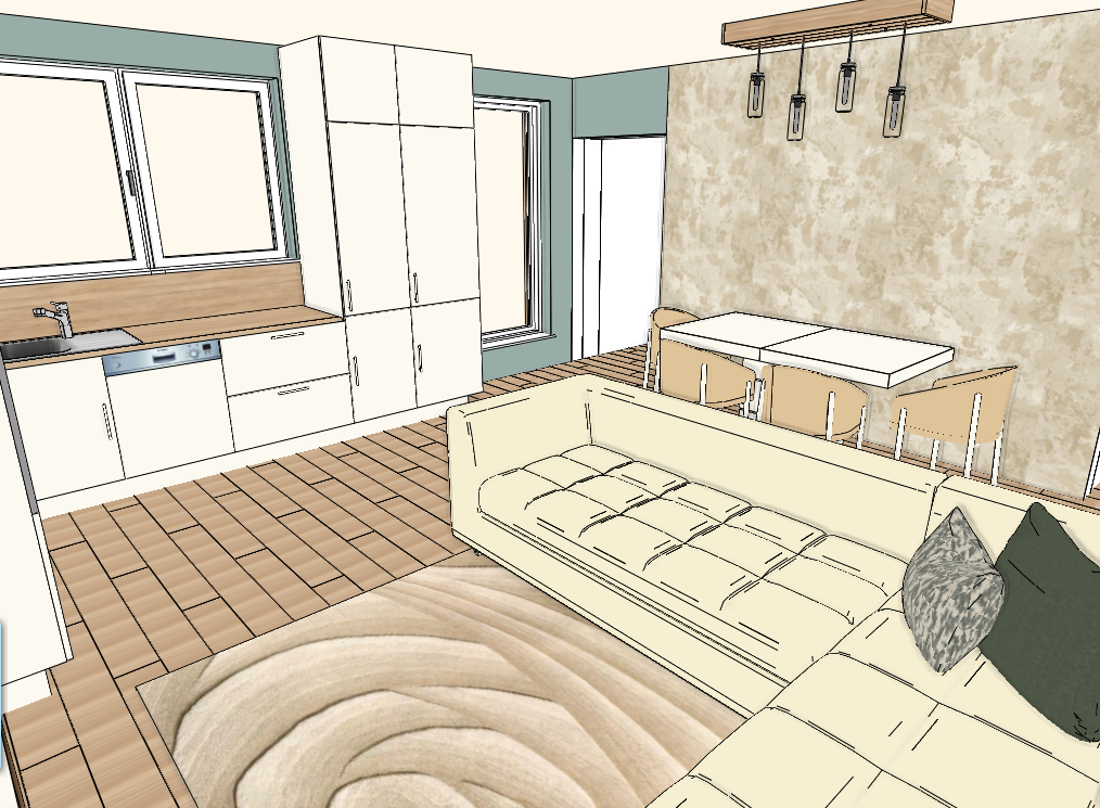 interior shot please make the picture have a nice scandinavian feel the kitchen is matte white no handles with a natural oak worktop and backsplash the floor is natural oak laminate the sofa is soft beige the wall is rosemary branch color the dining table is white surrounded by 4 round light beige dining armchairs with fine fabric on the wall behind the dining table is a nice light structured wallpaper and decoration leave the doorway no door needed no door frame needed the window overlooks a green landscape