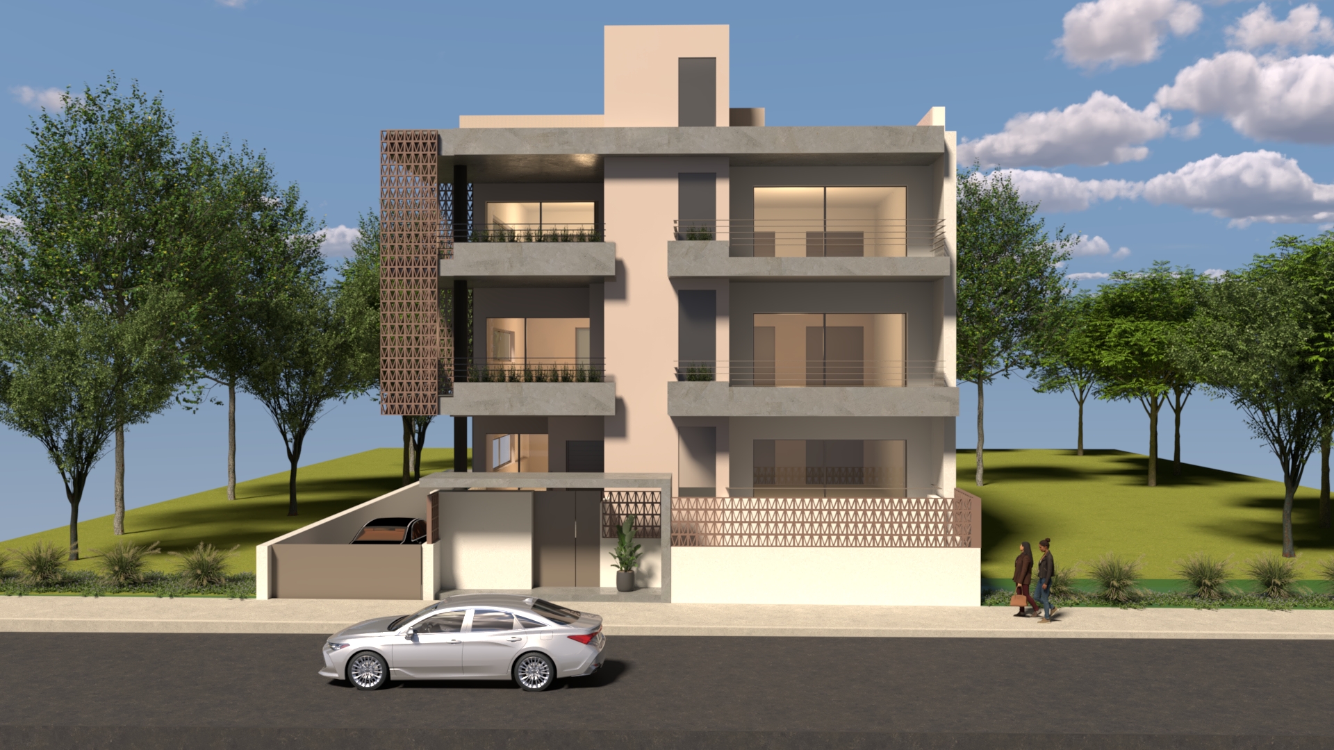 render a hyper photorealistic 3d perspective of this house located in nafplio greece keep the exact same model geometry without changing the architecture including the windows doors roof walls garage door pavement and driveway enhance the existing materials so they appear more realistic and high quality with natural textures and realistic glass reflections improve the surrounding landscape with lush mediterranean vegetation appropriate to the nafplio region such as olive trees mediterranean shrubs aromatic plants and natural planting use clear mediterranean daylight with a bright blue sky and subtle atmospheric depth lighting should feel natural and balanced creating realistic shadows and depth in the scene maintain the same camera view and composition while only improving materials lighting and landscaping render in ultra realistic architectural visualization quality cinematic lighting highly detailed textures professional architectural photography style hyper realistic rendering 8k resolution