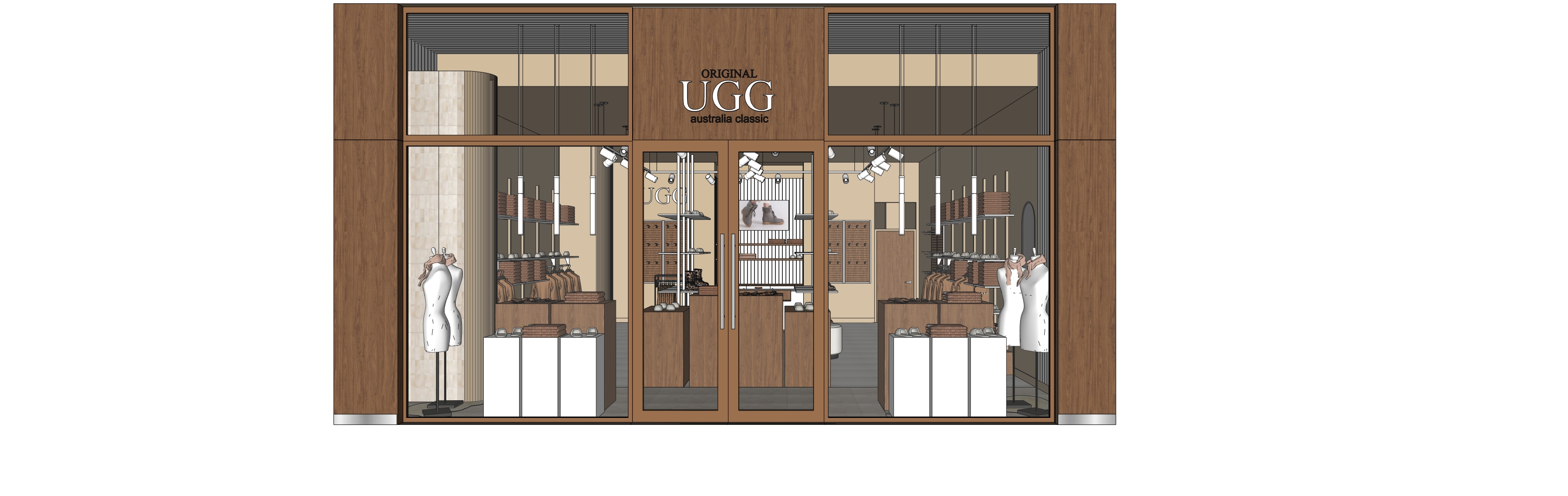 render with warm lighting and set with retail tenancies to each side ensure the timbers have a soft texture and remain walnut colour and grain illuminate the ugg in the shopfront signage and ensure lighting to the shop interior lights
