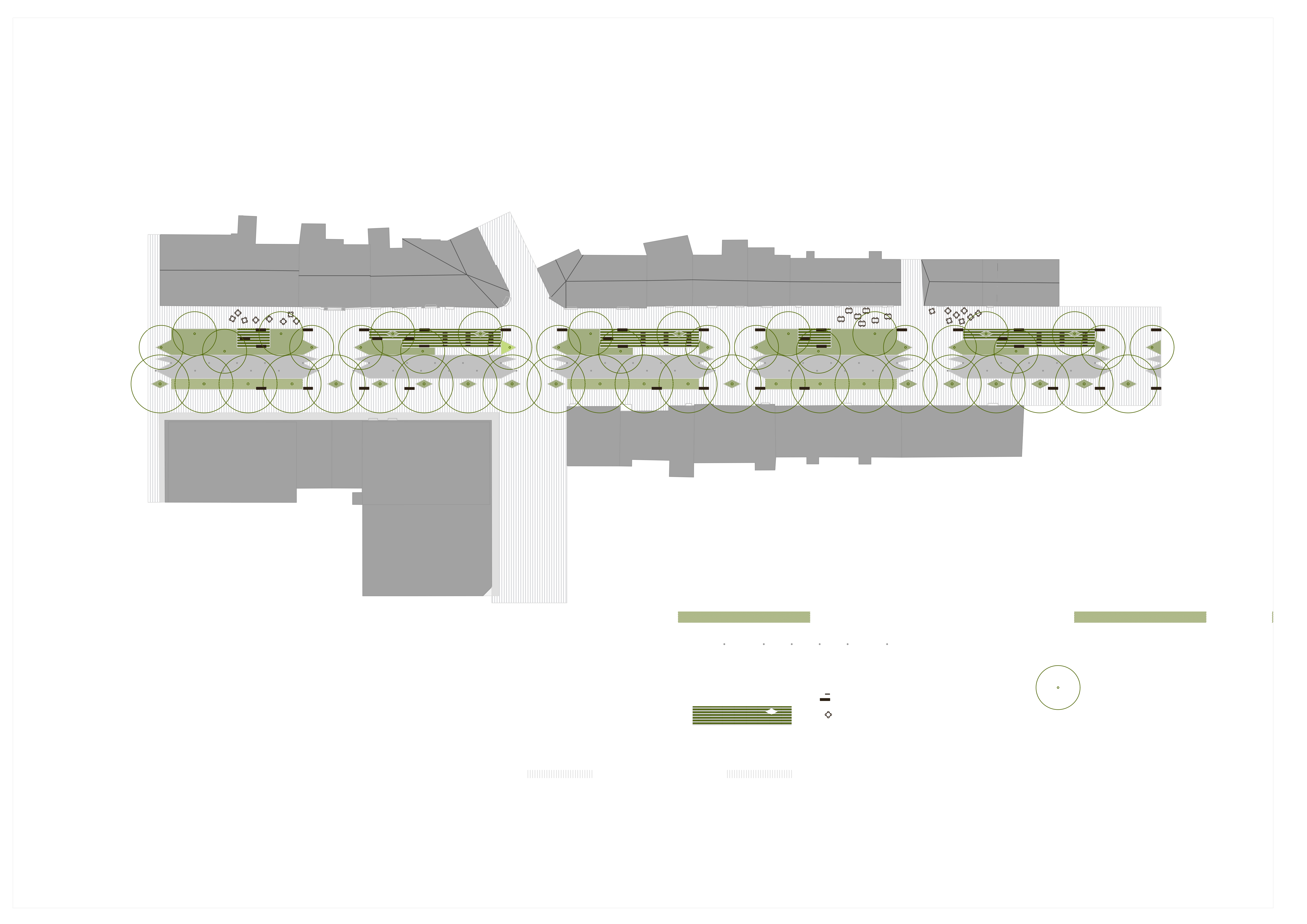 this is new street plan circles are trees and there are different type of floors the green is cut grass and little rectangles are benches or bycicle stands in the middle is bus lane and bike lane and up is bike lane in another direction