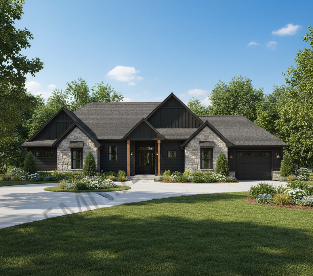 render this kitchen with dark blue base cabinets medium walnut upper cabinets brass cabinet handles brass sink faucet cafe matte white appliances with brass hangles and knobs quartz countertop with slight grey vein quartz backsplash with slight grey vein light oak flooring walls painted flat white and base molding glossy white