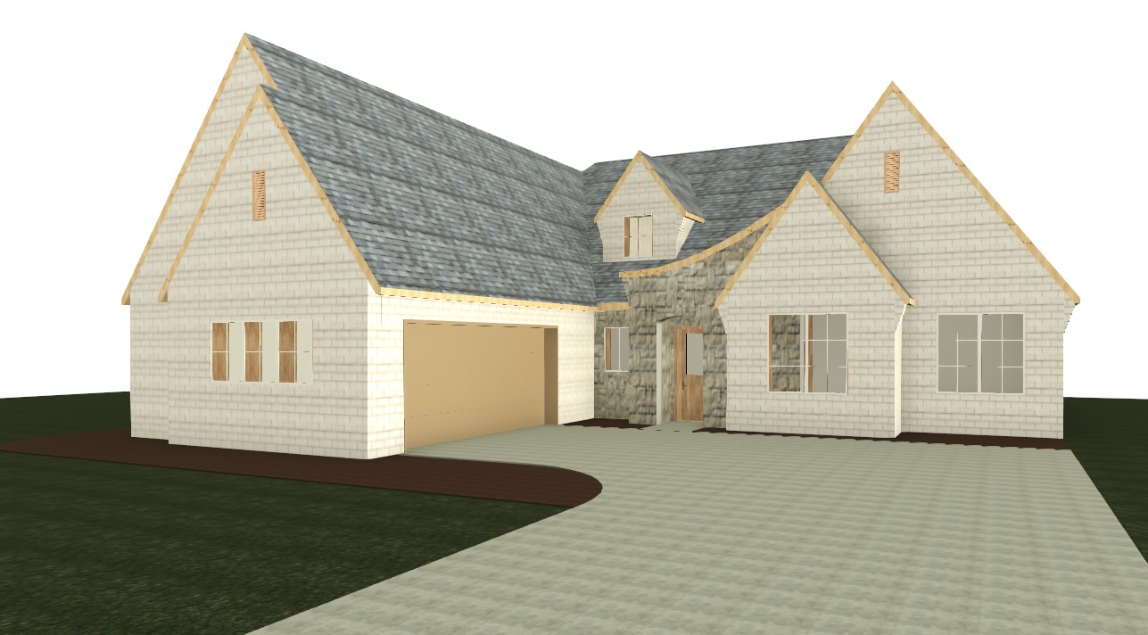 white bluff acme brick asphalt shingle roof tan colored windows white limestone stacked stone tan garage planting clean concrete driveway trees in background brick dormer