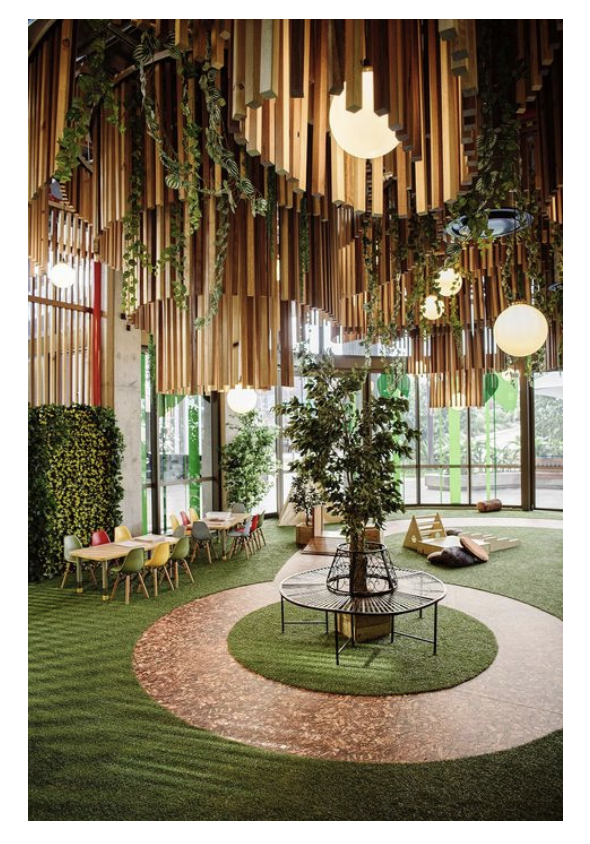 exterior shot entryway and check i lobby for a kids forrest themed physical therapy center please rneder a more photorealistic images with the same outine of the provided image please reference the mood board photo for the t ceiling concept and colors theme make feel like a lobby check in