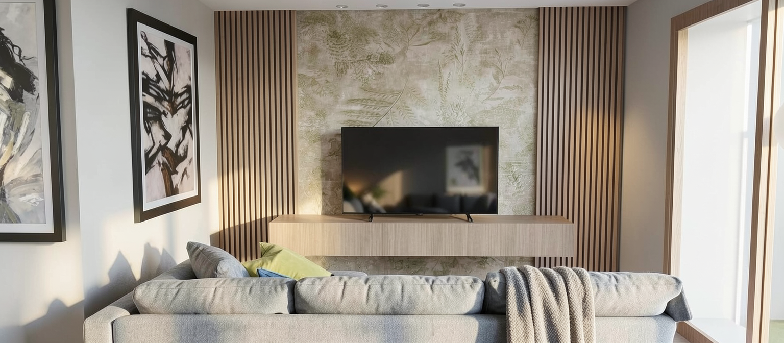 sofa is grey there is led light coming from the wood panels behind tv add more space between sofa and wall on the left