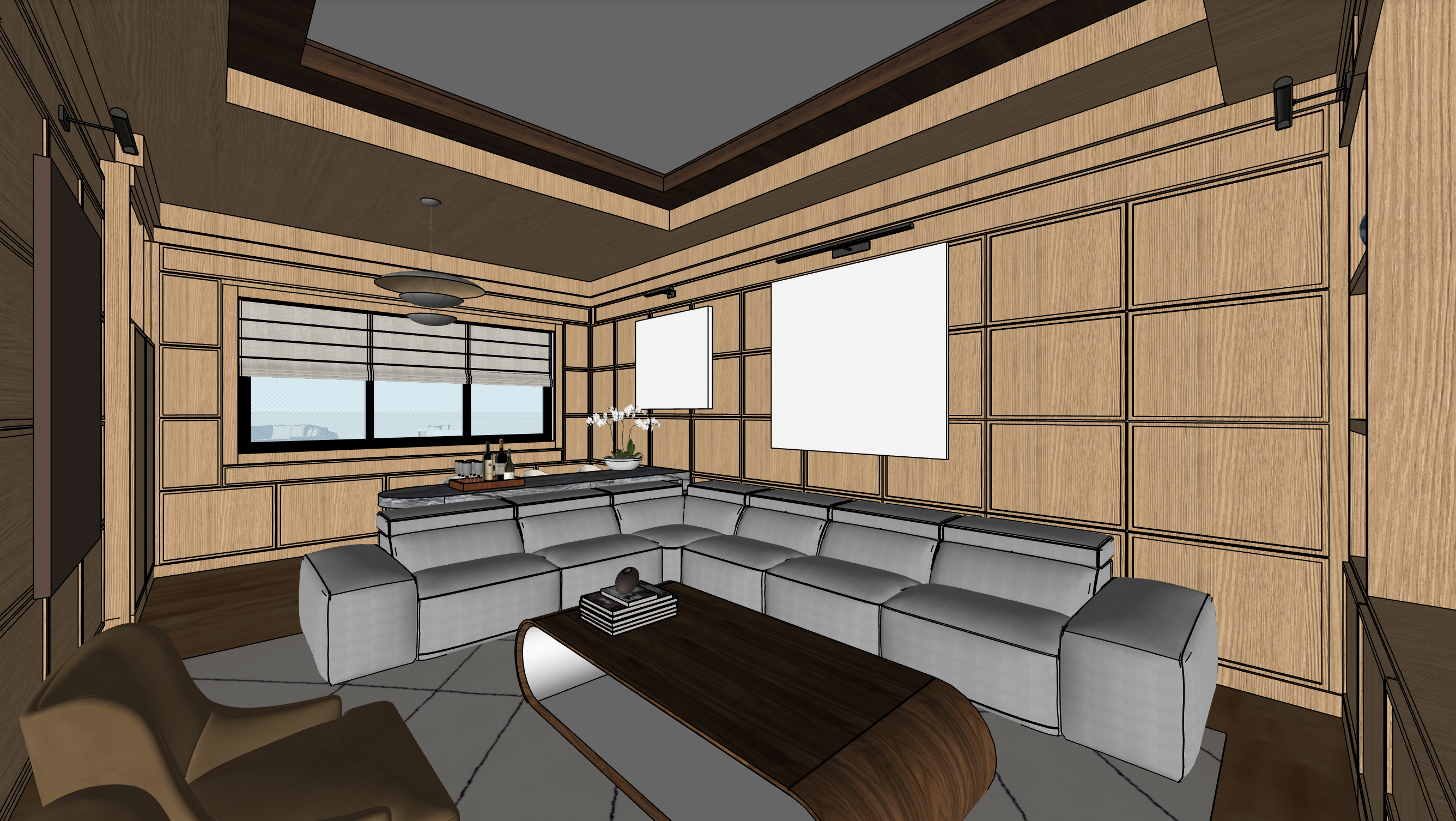 ceiling center is white the wood wall panels are oak and make the leather grey and shiny