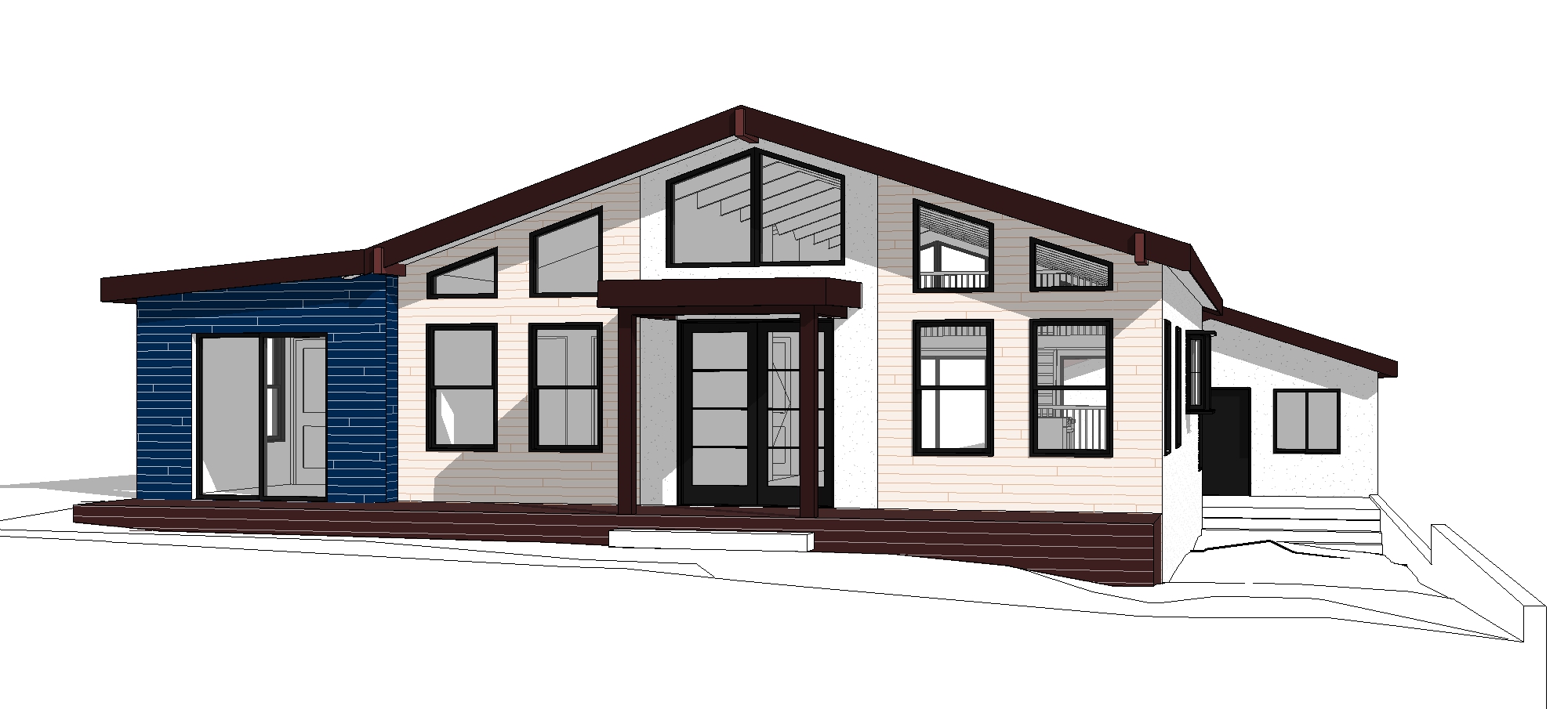 render a modern single story house matching this reference image use dark navy blue horizontal wood siding on the entire left volume of the house use medium brown horizontal wood siding only on the two side walls that frame the front porch entry overhang all remaining exterior wall surfaces must be white stucco with a smooth finish keep the roof color a deep brown maintain the same window shapes sizes and arrangement as the reference image preserve the front porch steps deck and overall geometry of the house