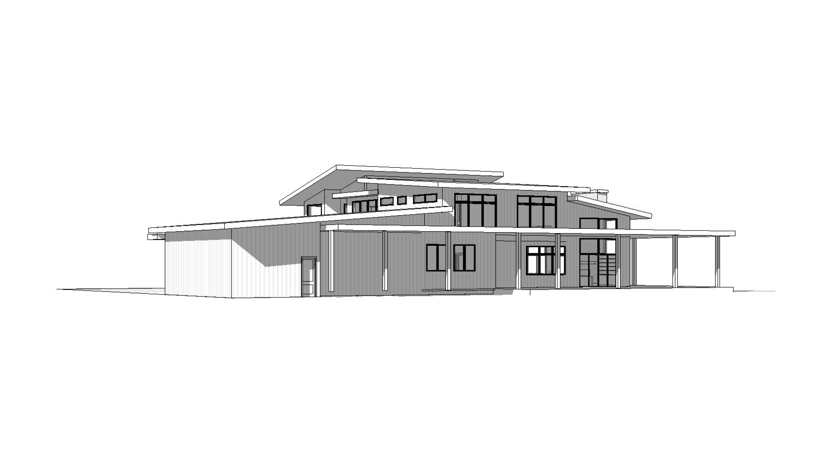 backyard view of a clean mountain modern home architectural exterior rendered in cinematic vibrant day time lighting beautiful blue skies with sparse clouds sun shining on the house with faint streaks of light warm vertical wood siding with similar simple minimal grain pattern black roof visible prominent snowy colorado mountain range landscape in the background natural wood textures high fidelity photorealistic visualization crisp shadow falloff refined fa ade geometry richly detailed grain patterns soft atmospheric depth calm minimal landscaping premium architectural photography mood ultra clean composition and materials beautiful manicured gardens with hedges lining the property photorealistic rendering flat roof