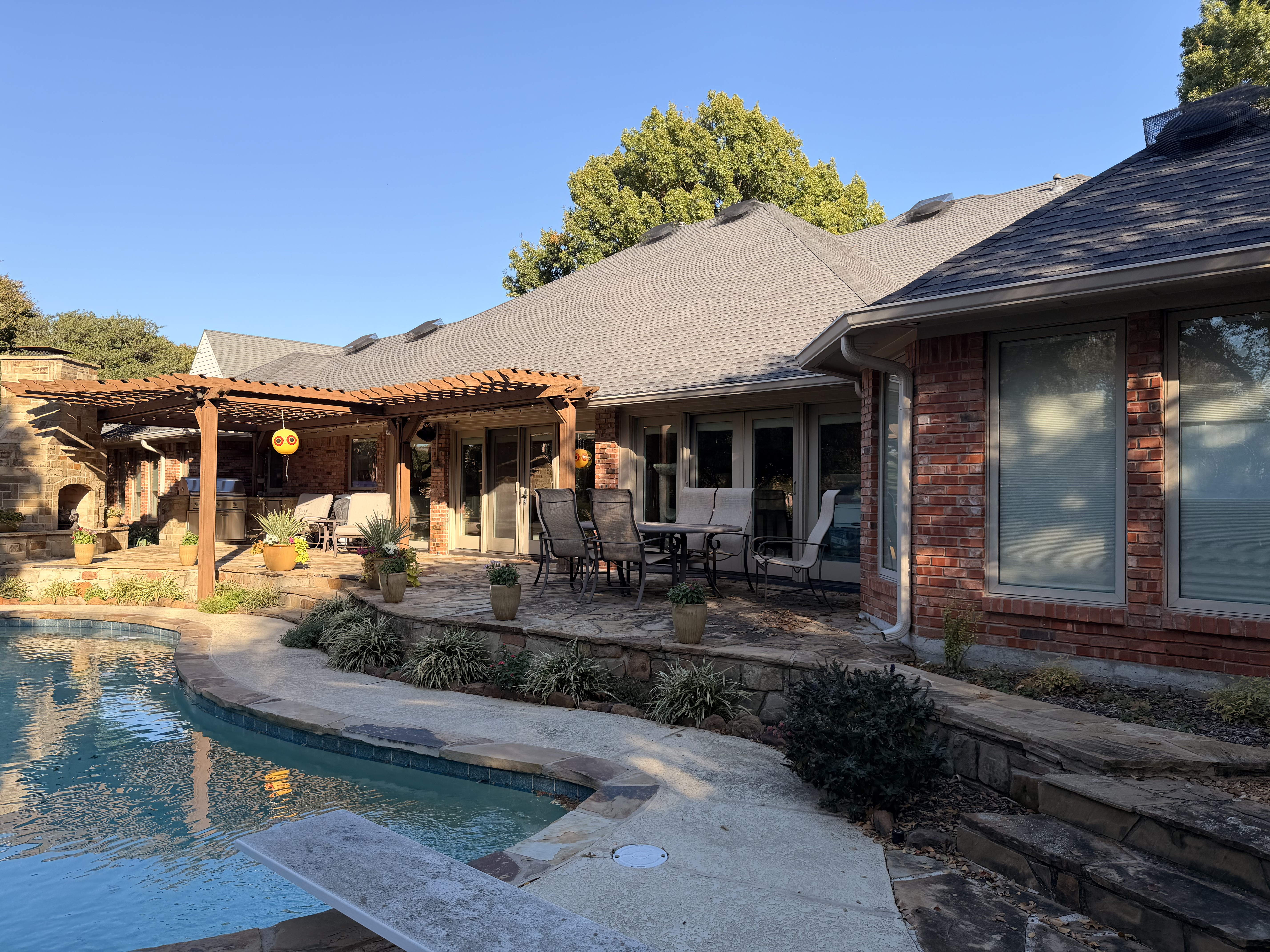 robert a m stern exterior shot brick warm orange and red gray roof wood trellis screen porch rafters swimming pool foreground one story house architecture