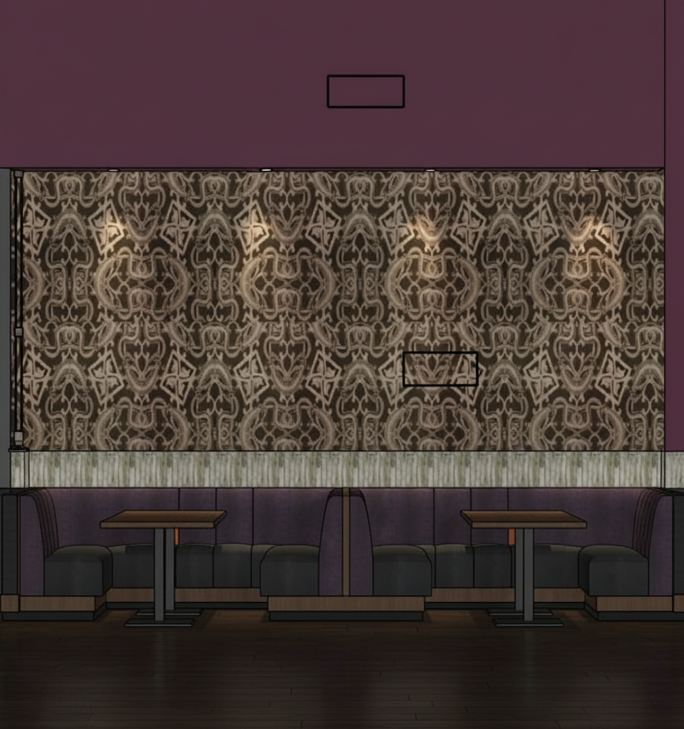 recreate this elevation of a restaurant booth alcove into a photorealistic elevation the atmosphere should be moody with a downlighting strip and shadowing the booth upholstery is glam gator in passion purple and the tile above the booths is komorebi brick in forest dew color the wallpaper above the tile should be maintained