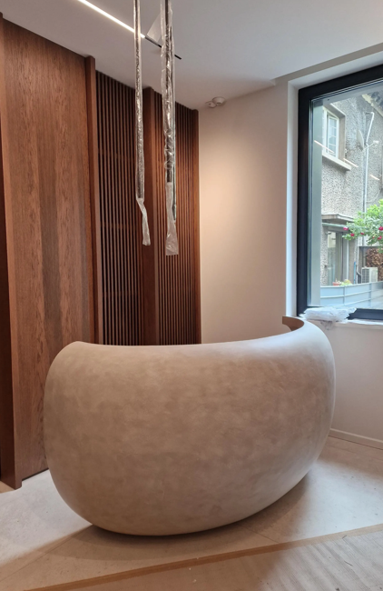 change this entry reception area for an ai company adding this reception desk with a translucent curved wall behind