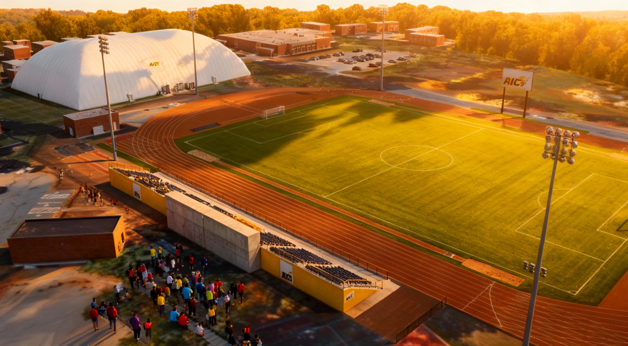aerial view of a beautifully designed sports complex a vibrant green soccer field with realistic grass texture surrounded by a track in warm earthy brown tones the bleachers are modern with metallic gray seats and bright yellow accents a large white domed stadium sits nearby surrounding the complex are lush green trees and shrubs giving a sense of a lively outdoor atmosphere the scene is bathed in soft golden sunlight creating a warm and inviting ambiance
