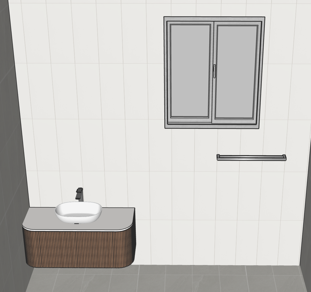 all fixtures are dark grey metal bathroom window frame is black vanity top is white back wall tiles are white side and floor tiles are dark grey