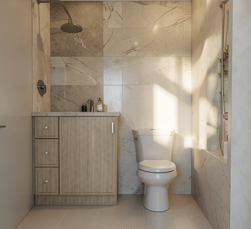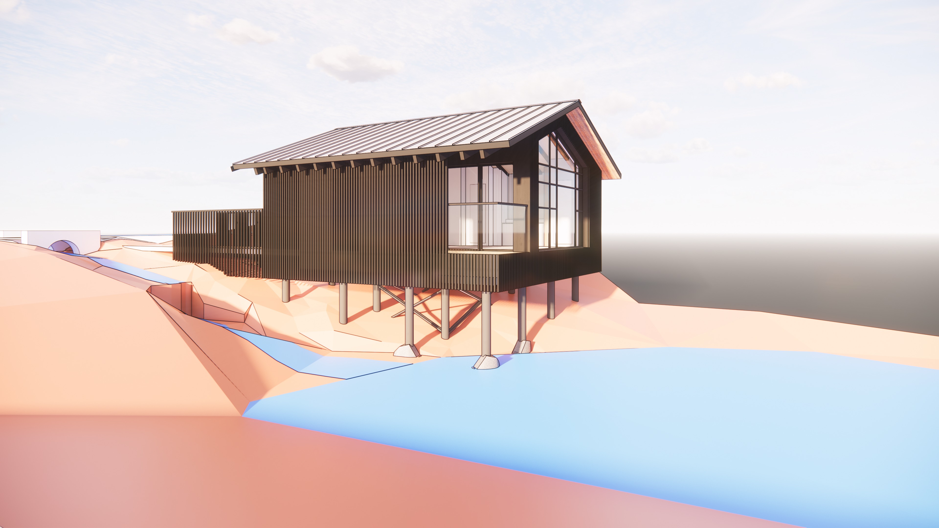 this is a house on top of small pond with small trees in the background the wall material is black burned wood please make it realistic and leave the landscape as it is the ground is dark brown with lush deciduous plants add darmera peltate plants under the house and around water leave the original structure i drawed the extent of the pond area in blue openings are in dark black