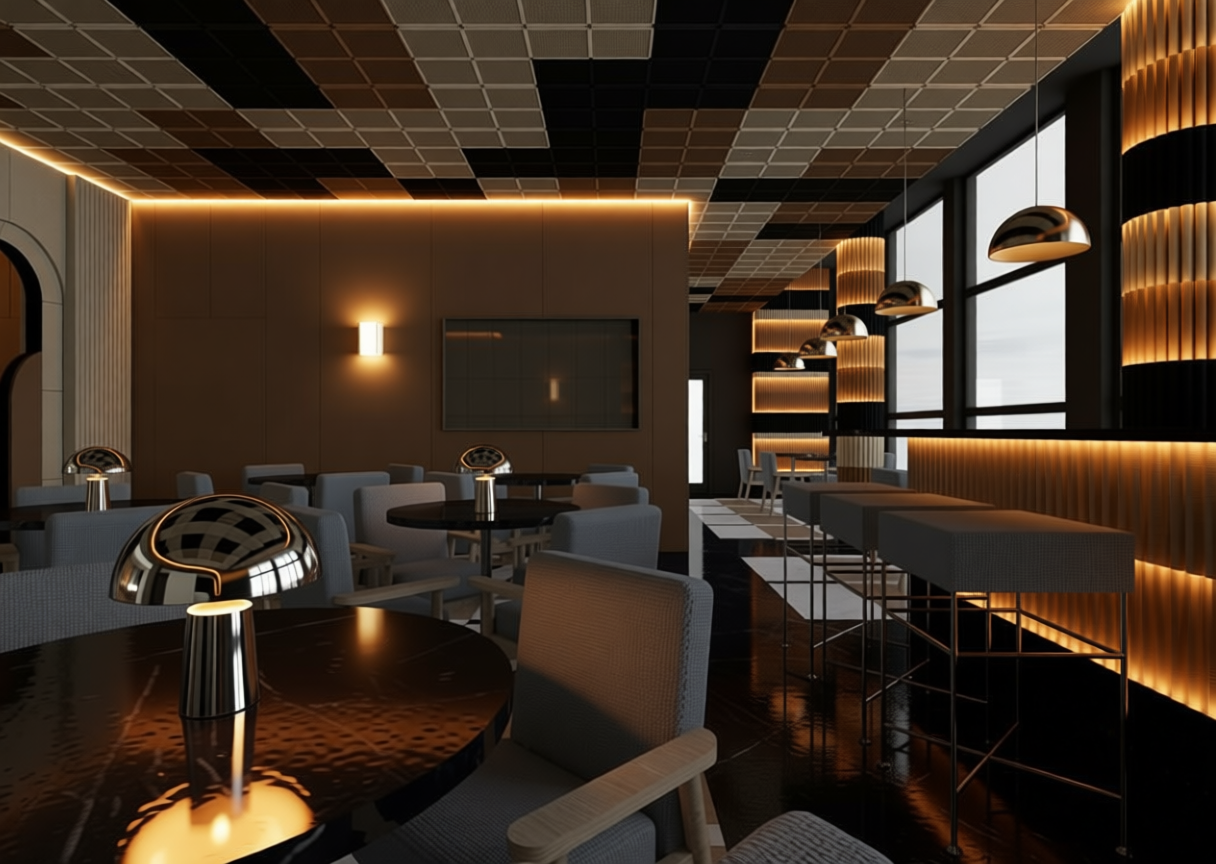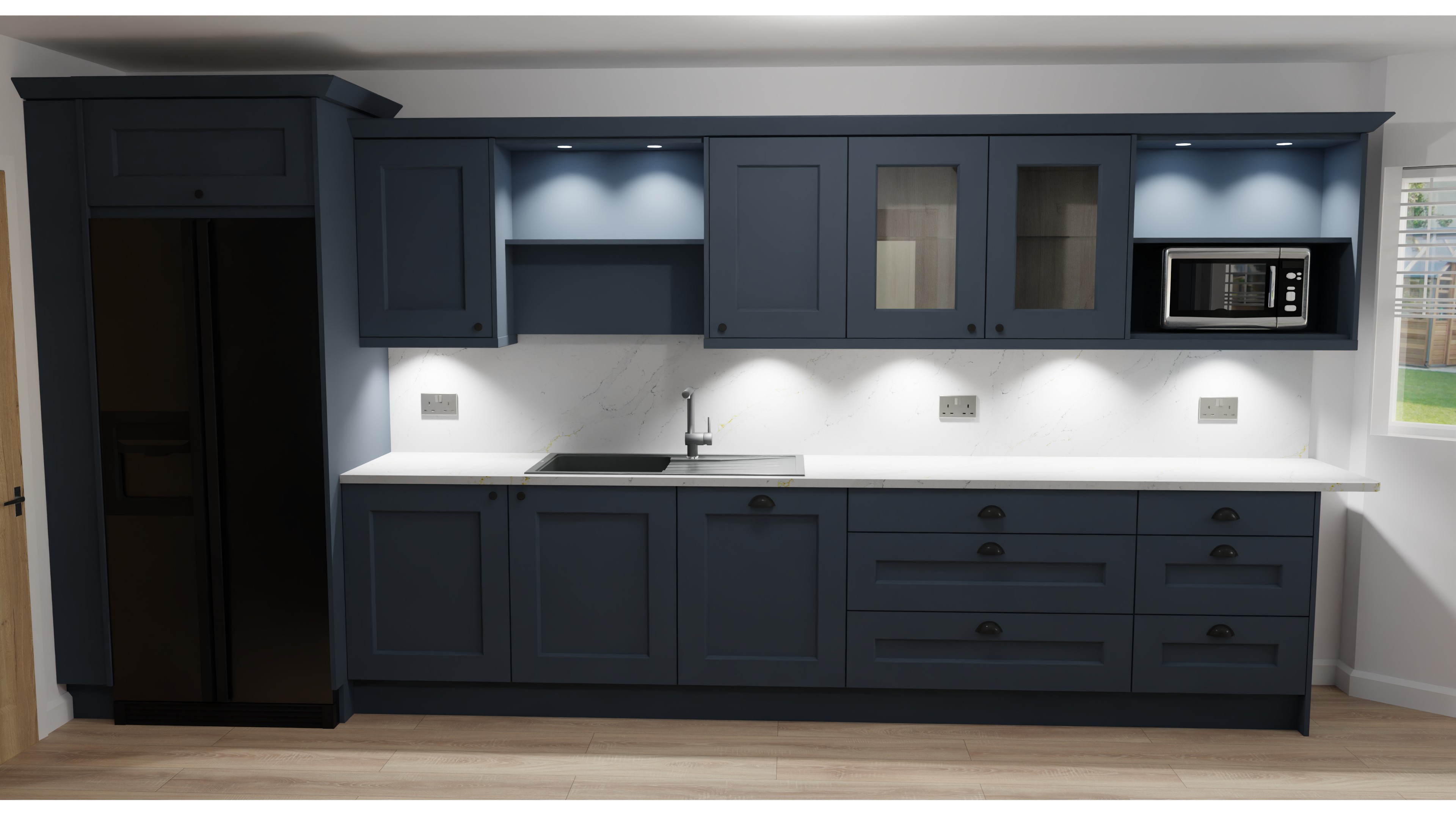 natural lighting airfyer chpping board with bread and fruit bowl on countertop glassware in the two glass door cabinets books above microwave and plants on shelf above sink