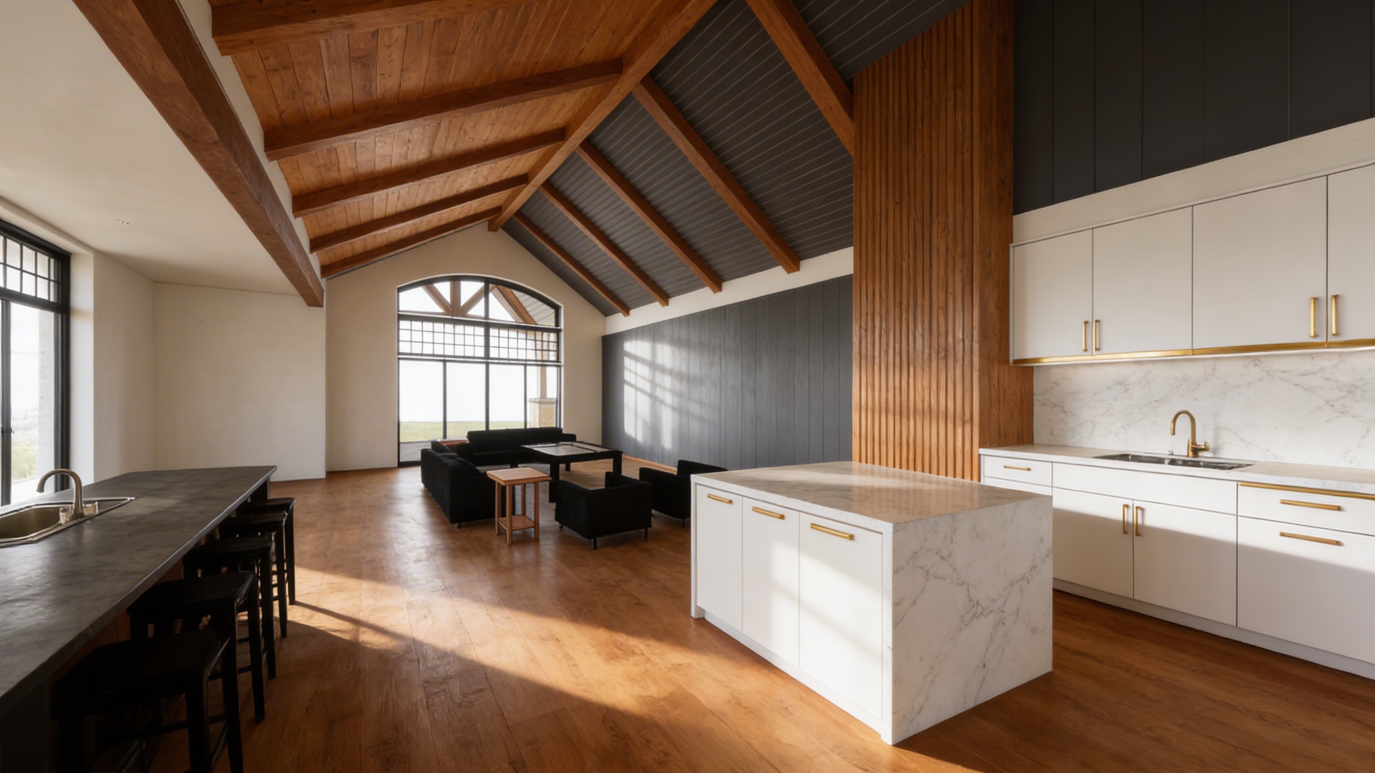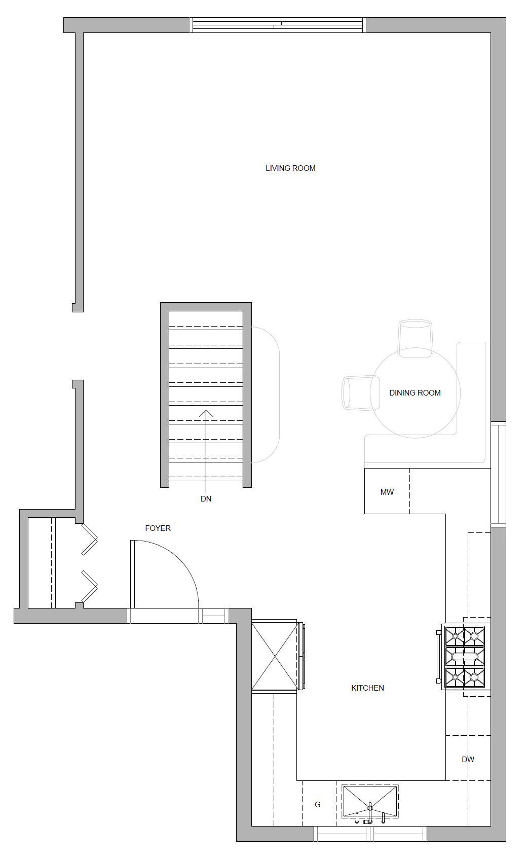 i have a floor plan of the house and want to generate 3d top view image do not change the structure make it warm colour pallete japandi style walnut finish base cabinet warm microcement texture on the wall make the hood for the induction range also microcement create natural light coming in from the window by the sink countertop will be warm concrete look banquet seat fabric to be warm linen look with some pop colour coushions mid century modern style dining table is walnut wooden with marble lazy susan on top decorate with some plants chairs for the dining table are lattan finish buffet table is wooden mid century modern style