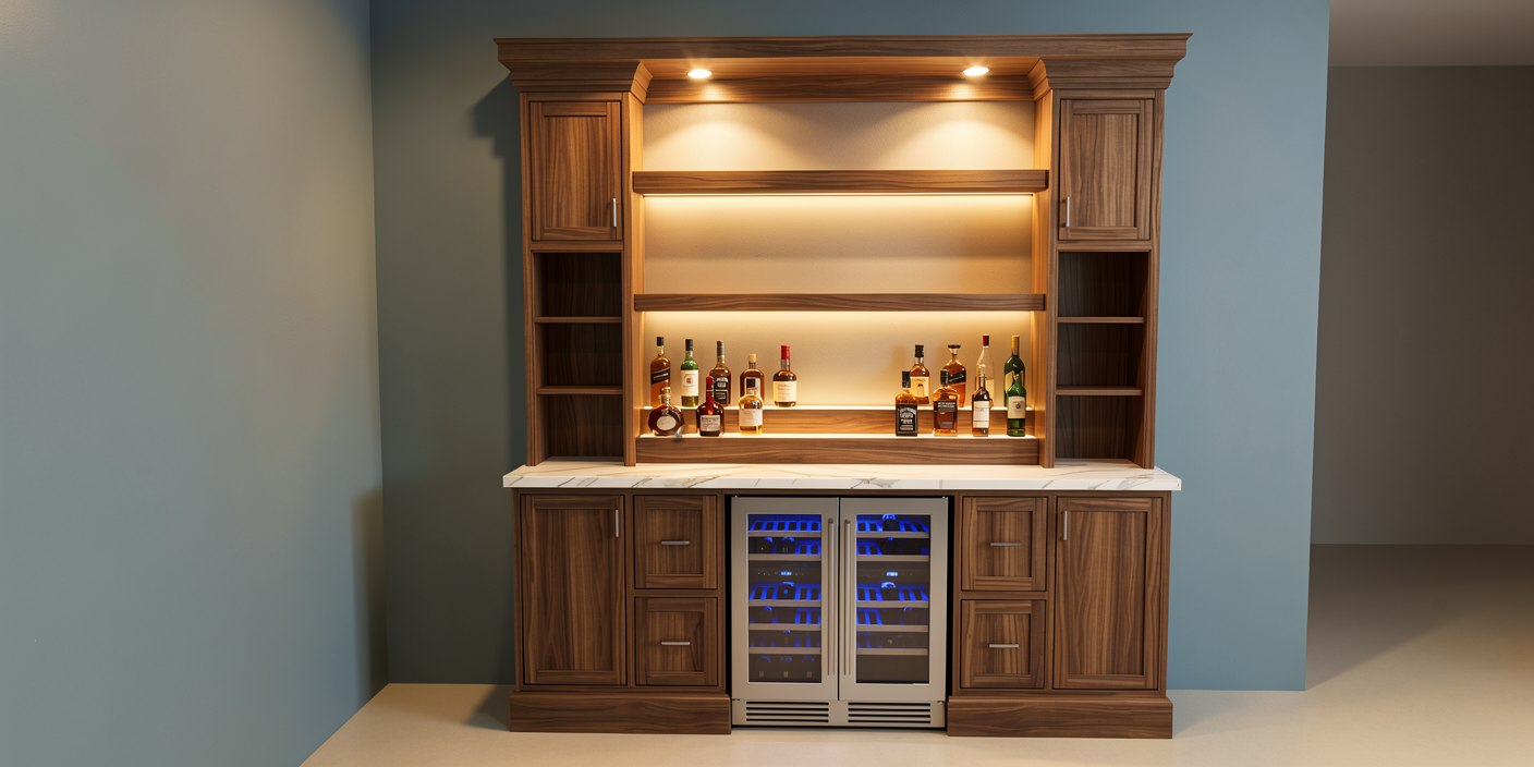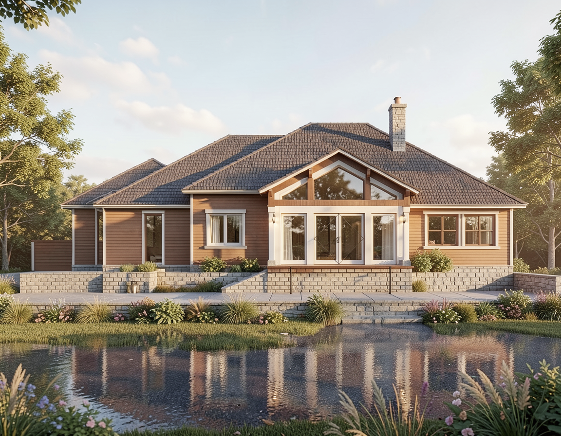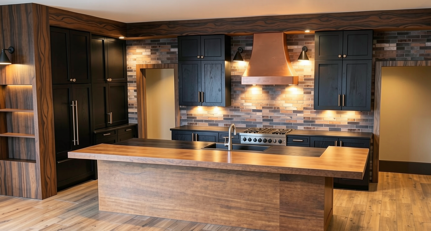 luxury modern kitchen design featuring black perimeter cabinets with visible graining and subtle brass handles the backsplash is made up of elegant multicolored slate tiles 12 x 3 in tones of gray and brown a sleek copper range hood complements the warm wooden tones of the center island and countertops both in rich walnut soft ambient lighting from stylish brass wall sconces creates a cozy and inviting atmosphere the wooden floor is a medium stained wood adding a touch of sophistication natural light flows through large windows highlighting the harmonious blend of textures and colors the perimeter countertop is a dark sophisticated granite with caramel beige and slate running through the soffit above the perimeter cabinets and down the open shelving is a antique rustic medium wood keep original layout angles colors create a realistic photo