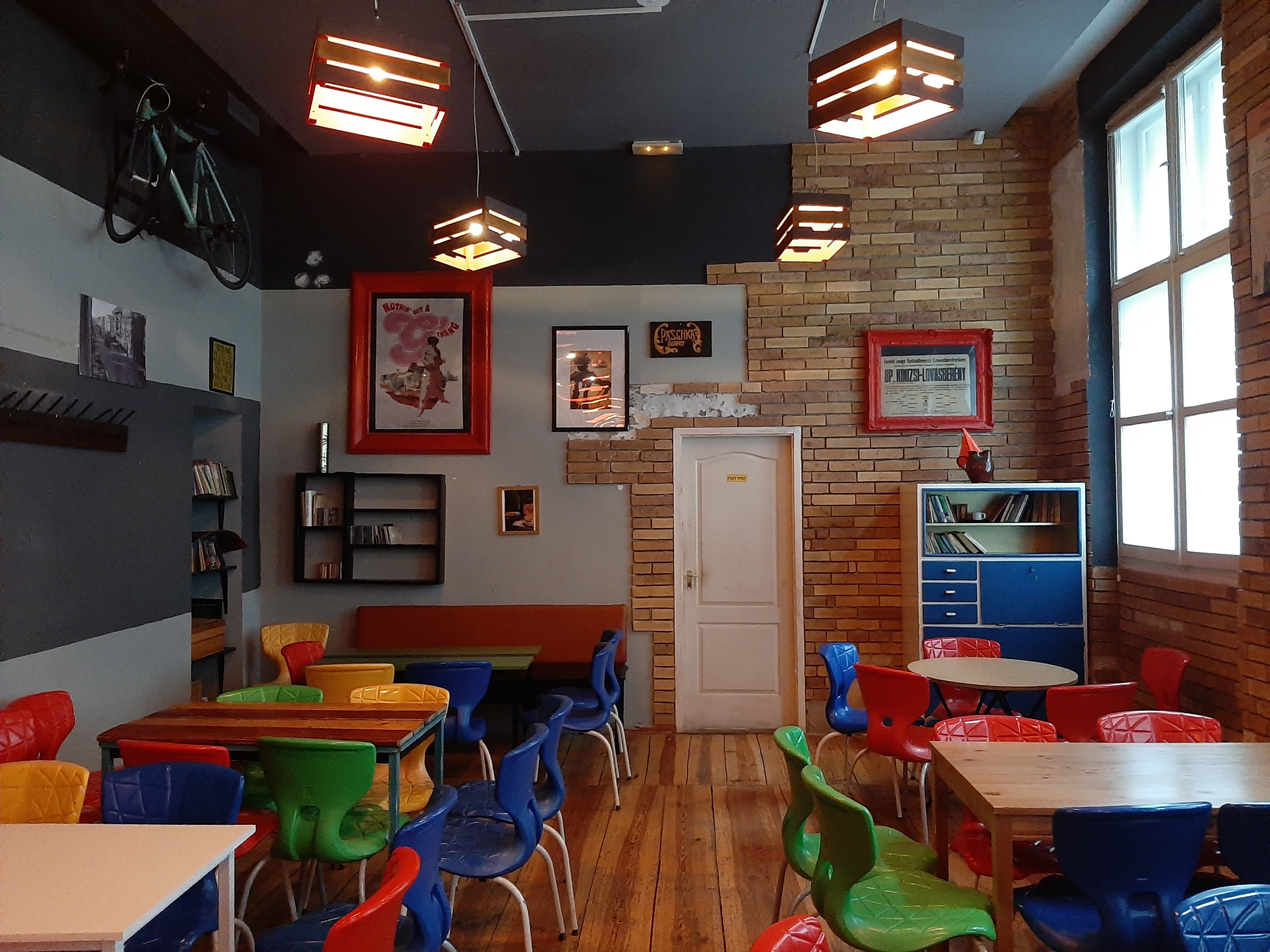 new urbanism interior shot create a cozy retro themed cafe interior with a warm and inviting atmosphere use a palette of deep reds and vibrant blues for the chairs with touches of bright green and vivid yellow for accents the walls should feature a mix of exposed brick in warm earthy tones and light grey paint providing a rustic yet modern contrast incorporate wooden flooring in rich honeyed brown shades to add warmth the ceiling should have sleek dark grey tones and contemporary pendant lights casting a soft glow enhance the space with colorful framed posters and a vintage bicycle mounted on the wall for a quirky touch natural light streams in through large windows adding a bright and airy feel to the environment take away the brick wall and change the chairs to teracotta coloured polstered chairs all tables should be round architecture