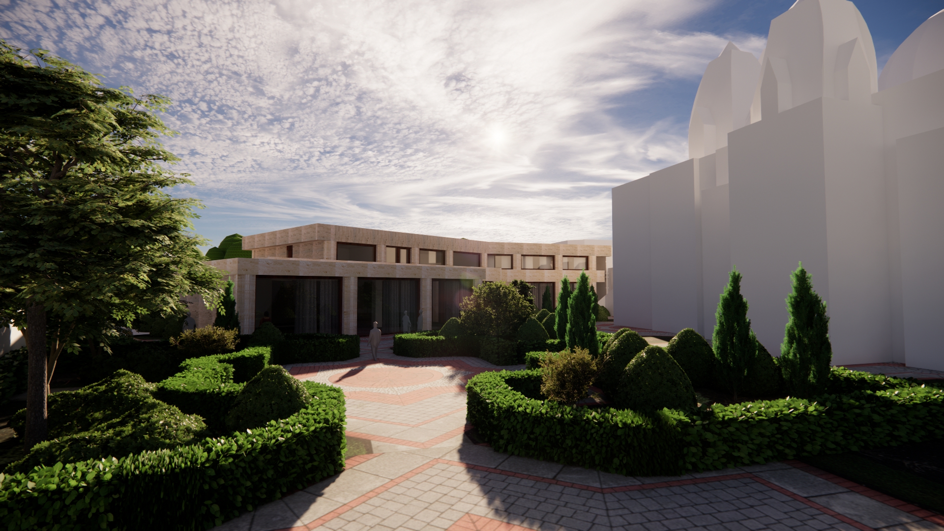 exterior shot i want the whtie building from the image to match the building from the mood board