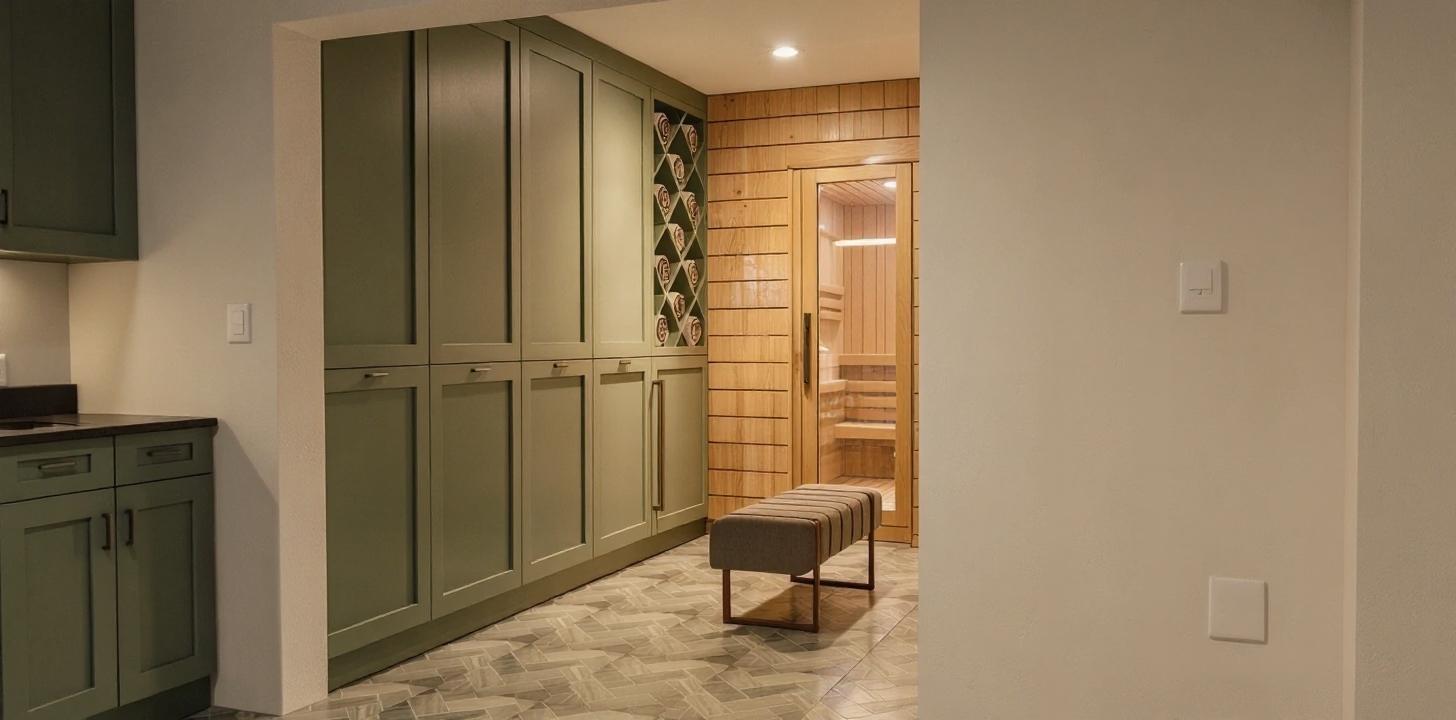 add more light to each of these rooms to resemble additional recessed lighting within the space remove items from the wall on the right side of the image leave the towel cubbies in the image