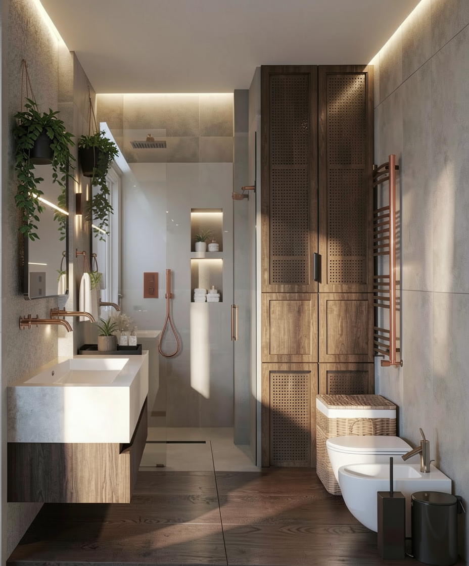 show a realistic view of this bathroom two sinks put shower valve next to shower door