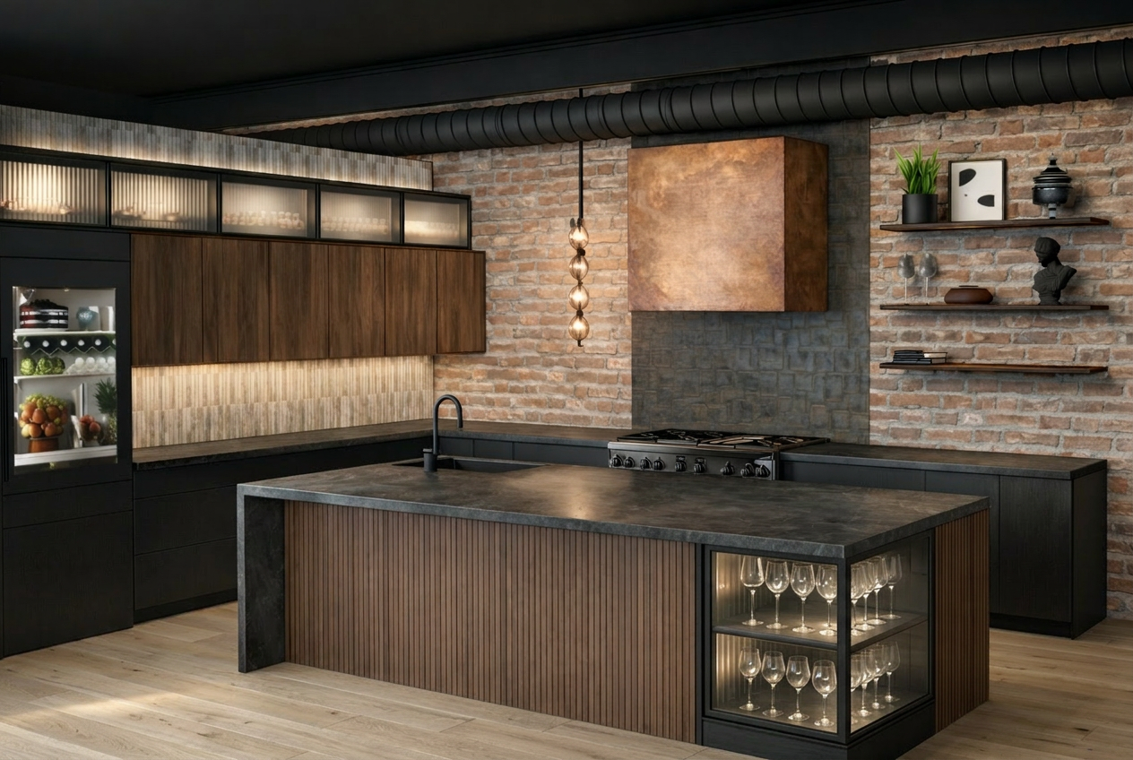 create a hyper realistic rendering with soft morning light through the windows interior shot of modern flat kitchen natural oak wood cabinets comfy sofa with throw tone should be relaxing and inviting pendant above dining table