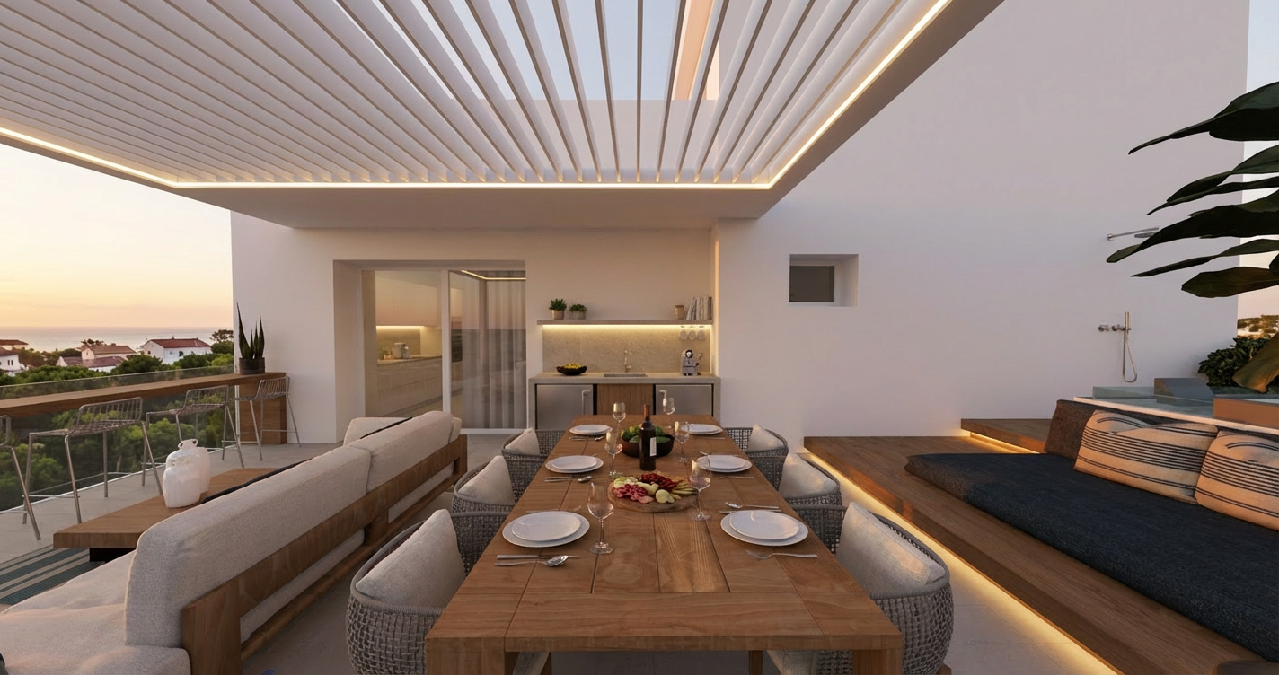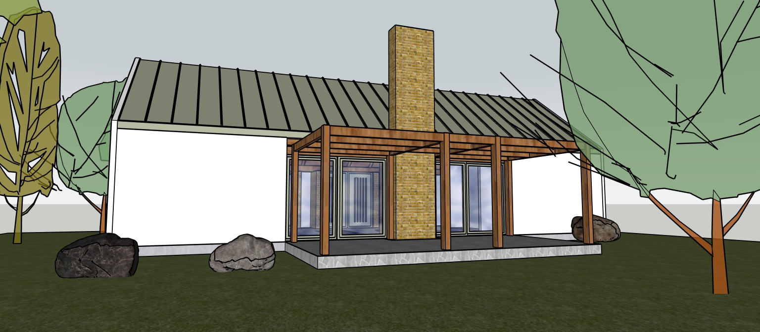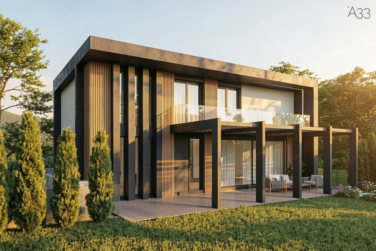 make a 3d photorealistic picture keep material as they are plaster white old brick wood lighter essence metal sheet olive gray color but make teh texture look real put bushes and trees around the house mountain style make it on arainy summer sunny day
