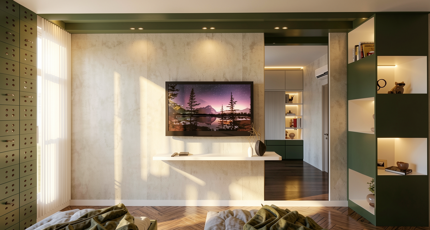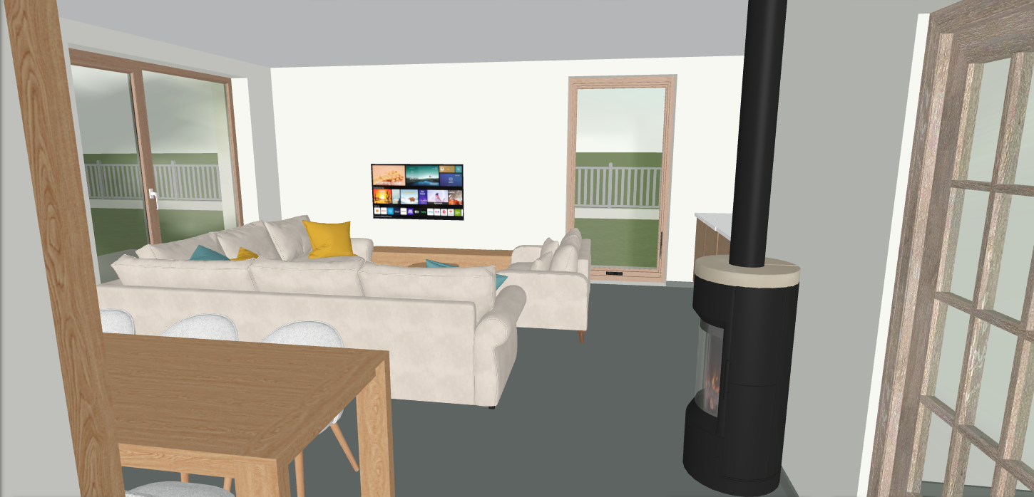 floor lighter whitened oak in a herringbone pattern kitchen natural oak veneer white countertop the other furniture and doors also in natural oak veneer dining table in solid wood keep all elements as they are same sizes and placements and roughly the same colors just make it look realistic kitchen is handleless no visible pulls add curtains to the windows in a light pastel colour add some books to the bookshelf handles and similar hardware elsewhere should be silver brushed stainless steel add scandinavian style pendant lights above both the coffee table and the dining table simple minimal designs white colour warm light strictly match the exact space and dimensions keep the original layout and proportions exactly as in the reference images