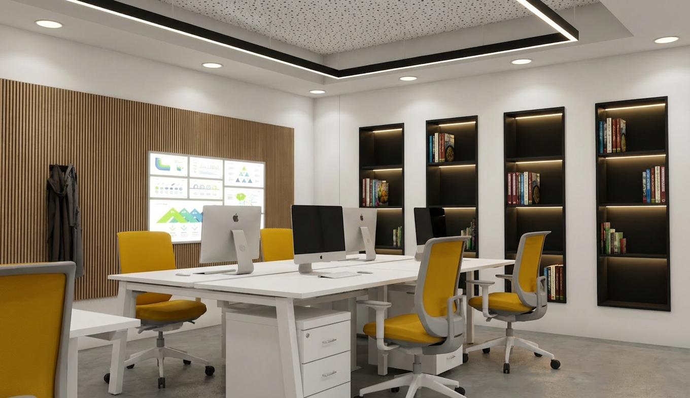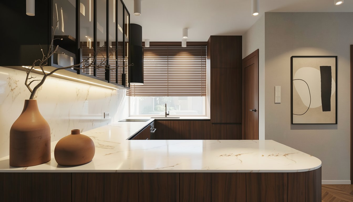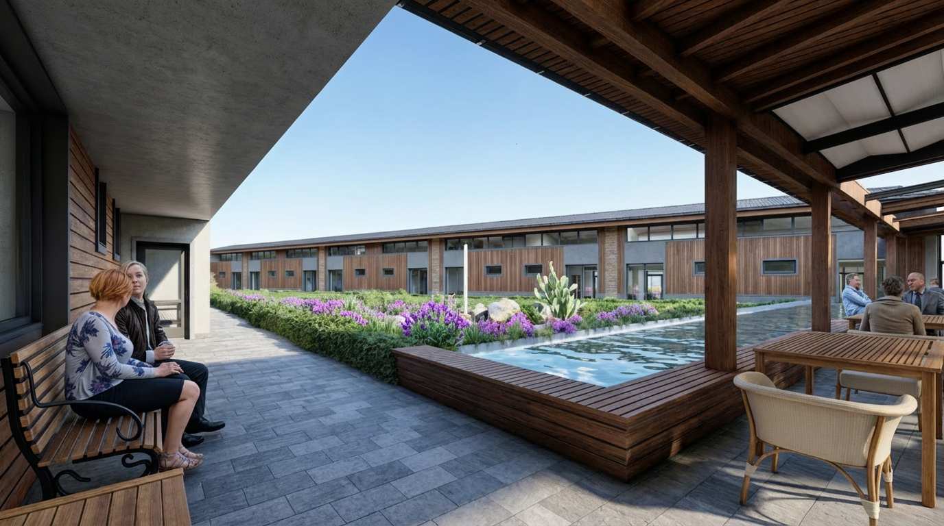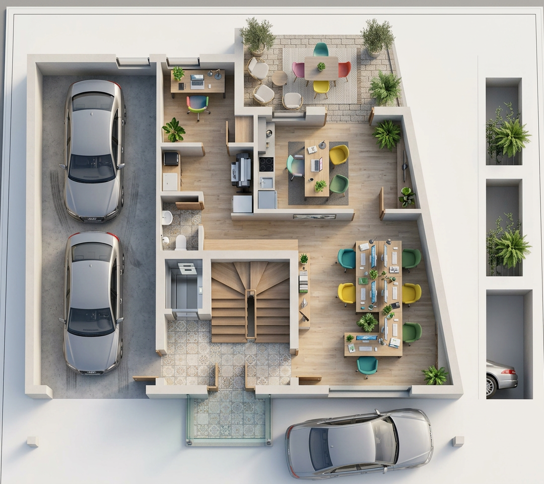 render a modern bathroom with a serene and soothing atmosphere the walls are adorned with light beige textured tiles the shower area features an elegant glass divider and the wall behind it is decorated with a soft pastel palm leaf pattern in shades of muted pink and taupe a lush green indoor plant adds a touch of nature standing in a sleek dark gray pot include minimalist concrete planters with small succulents the overall lighting is soft and warm enhancing the tranquil and inviting mood of the scene