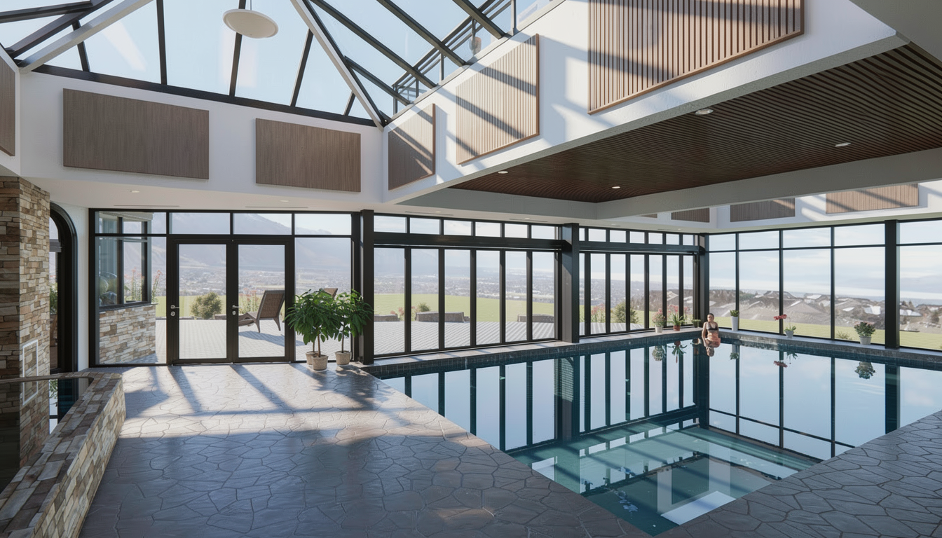 maintain geometry render a serene indoor pool area with large panoramic windows allowing soft natural light to illuminate the space the floor is composed of elegant gray stone tiles that reflect the sunlight the ceiling features warm rich wooden panels creating a cozy atmosphere the walls are clad in a fine white plaster contrasting with warm canvas panels for a modern touch potted plants with lush green foliage enhance the natural feel of the room while distant views of a mountain valley are visible through the glass the overall ambiance is peaceful and inviting perfect for relaxation and leisure
