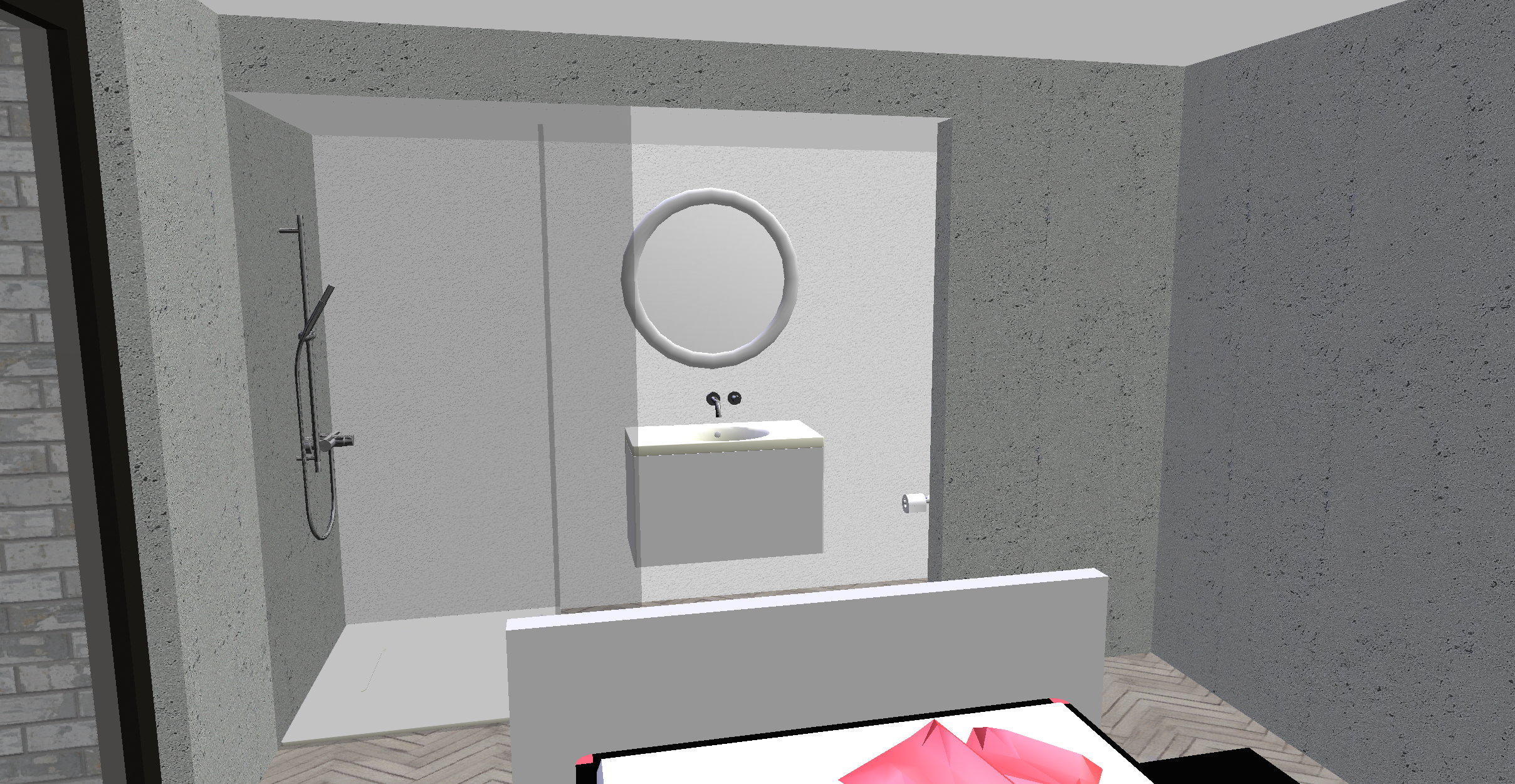 genau dieses rendering berarbeiten fotorealistisches innenraum foto exakt dieselbe perspektive und kameraposition wie das hochgeladene referenzbild 100 identische raumgeometrie exakt gleiche m belanordnung exakt gleiche verlegeart und richtung von parket und platten wie vorlage parket ruhig und hellgrau weiches nat rliches tageslicht raum k nstlich ausleuchten sanfte realistische schatten realistische materialien stoff mit leichten gebrauchsspuren hochwertige oberfl chenreflexionen lavabo komplett aus marmor collemandina grigio in braungrau dunkel lavabo innen ebenfalls collemandina im unterbau im obersten drittel eine griffmulde ber die ganze breite ganzer unterbau in collemandina unterbaum bel mit unterbaubeleuchtung dahinter eine gessi wandarmatur edelstahl vollkommen rahmenloser und hinterleuchteter spiegel mit echten spiegelungen links neben dem lavabo ist die dusche armatur ersetzen mit thermostatmodul axor select 460 90 mit stabhandbrause und grosser brause mit anschluss aus der wand alles in edelstahl geb rstet an der hinteren wand eine nische dellco in box luna in der gr sse 30x30cm mit led licht w nde in der dusche und boden collemandina grigio in braungrau alle sichtbaren w nde sind sichtbeton schwarze steckdose rechts vom lavabo auf gleicher h he wie die armaturen schwarze runde deckenspots im bad und im zimmer bett wie vorlage modern mit kopfteil aus beigem abgestepptem stoffbezug mittig im raum parket im zimmer ruhig und hellgrau boden im badbereich collemandina grigio in braungrau links bei der dusche ein grau get ntes durchscheinendes glas gr sse die dunklere fl che in der vorlage fassade aussen aus hellgrauem klinker sehr moderner minimalistischer look nat rliche farbwiedergabe golden hour feeling hell ausleuchten das bild muss wie eine professionelle fotografie aussehen es soll ein echtes und reales foto sein canon eos r5 35 mm festbrennweite f 2 8 hyperrealistisch dslr qualit t raw aufnahme 8k aufl sung extrem scharf perfekte tiefensch rfe professionelle architekturfotografie
