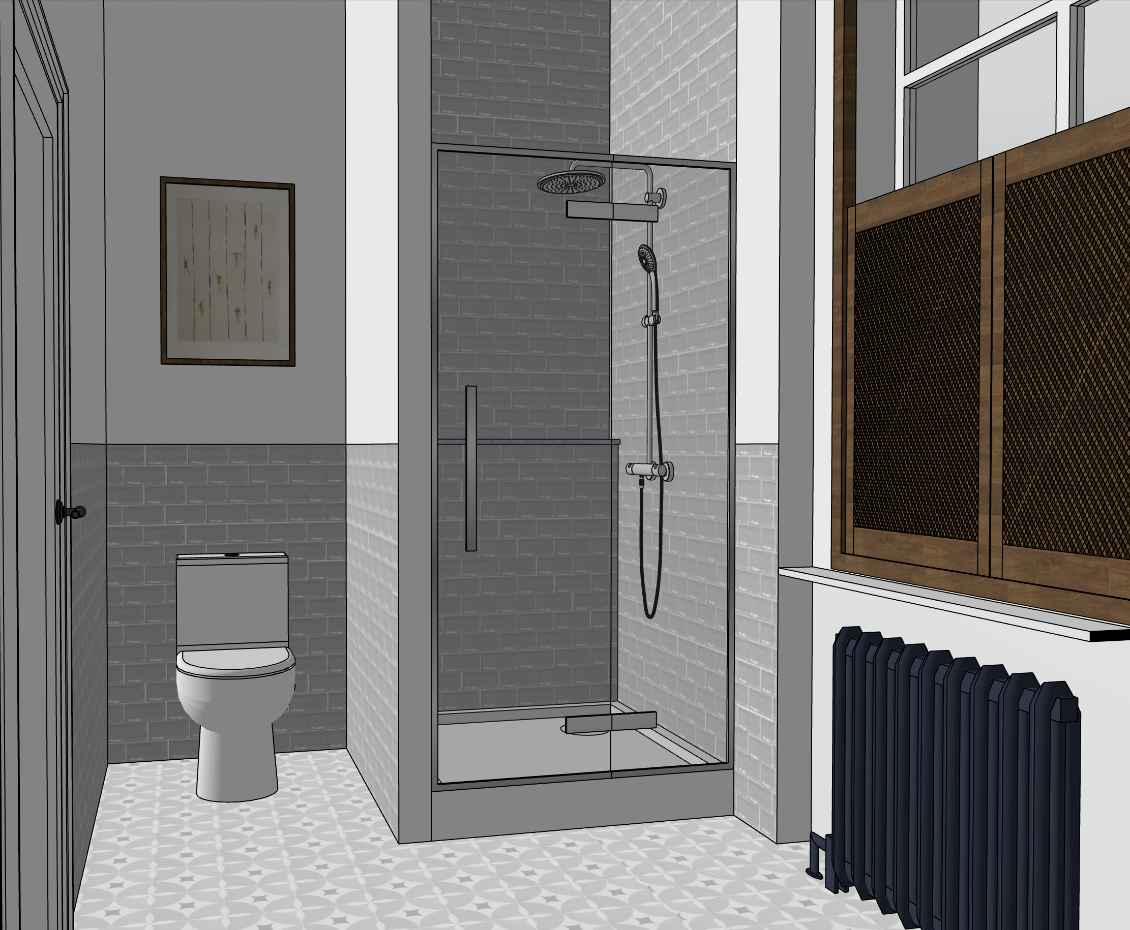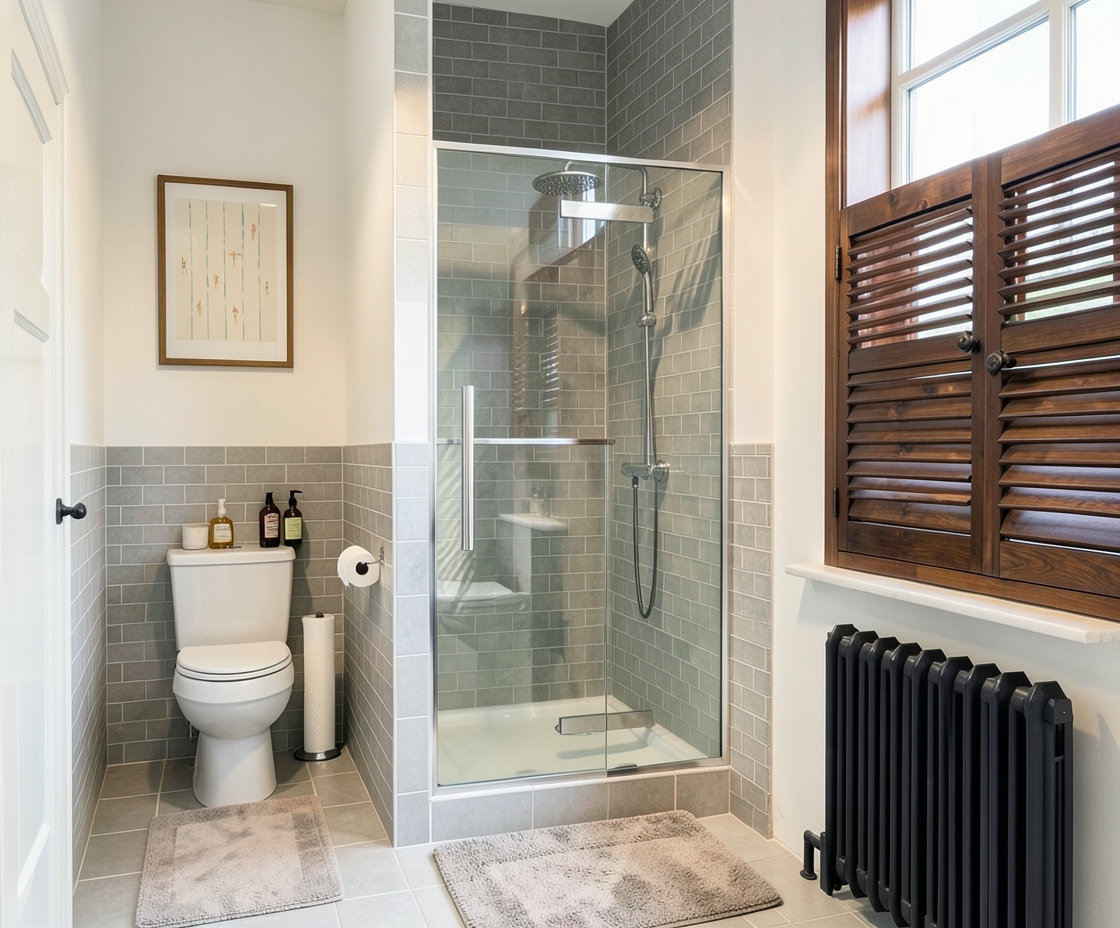 a bright bathroom with gray ceramic tile chrome finishes gray patterned floor tile simple cotton bath matt wooden shutters