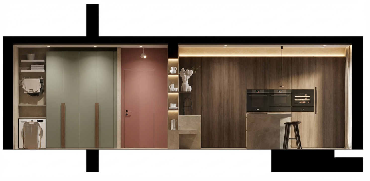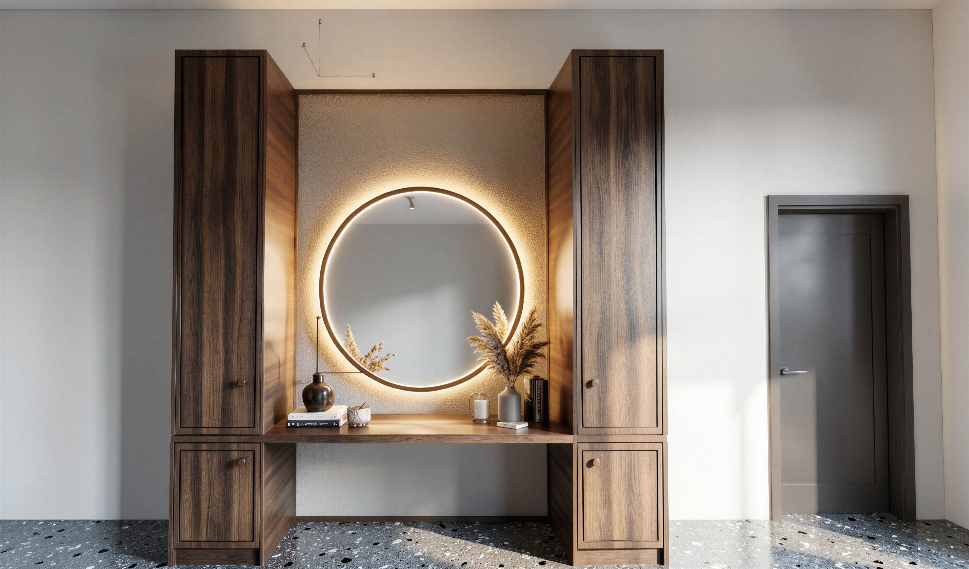 create an ultra realistic luxury interior render based exactly on the provided image keep the same architecture wall composition circular focal element cabinetry proportions shelf table position door location floor finish and camera angle exactly as shown do not change the design or geometry in any way main goal make this render look fully realistic refined and professionally photographed not cgi improve material realism texture depth lighting behavior shadows reflections and small interior details keep the atmosphere warm elegant and premium wood finish match all wood cabinetry and framing to the previously provided dark warm walnut smoked walnut reference use a luxury dark walnut veneer with rich natural grain soft flowing movement subtle tonal variation seamless texture mapping and a premium matte satin finish keep the wood elegant and deep not too orange not too red not too black and not grey circular focal element keep the rounded circular feature exactly as designed maintain the warm backlight led behind the circle make the backlight soft elegant and architectural with realistic light diffusion and warm glow on the textured panel the circular feature should feel like a premium focal point clean and refined floor keep the floor as real grey terrazzo tiles in a larger tile format make the terrazzo realistic with visible tile joints correct scale natural aggregate variation and subtle polished reflection do not make the terrazzo chips too small or too busy styling keep the tabletop styling elegant and minimal add one tasteful indoor plant on the left side near the wardrobe realistic and refined suitable for a luxury interior the plant should feel natural soft and premium not too large and not cluttering the composition keep the rest of the accessories balanced and sophisticated lighting and realism improve the daylight so it feels softer and more photographic combine natural daylight with the warm backlight led behind the circular element add realistic contact shadows ambient occlusion subtle reflections and natural light falloff make all materials feel physically accurate and realistic add subtle imperfections and better surface response so the image feels like a real interior photograph openings remove all opening lines from the door and any visible windows openings keep the door and openings clean minimal and realistic important do not change the design do not change the proportions of the circular element cabinetry or wall composition do not move architectural elements only improve realism lighting material quality terrazzo floor realism and add one indoor plant at the left near the wardrobe add this extra line too make the final image look like a professionally photographed luxury interior with premium walnut veneer realistic warm backlight led subtle natural imperfections and believable material depth