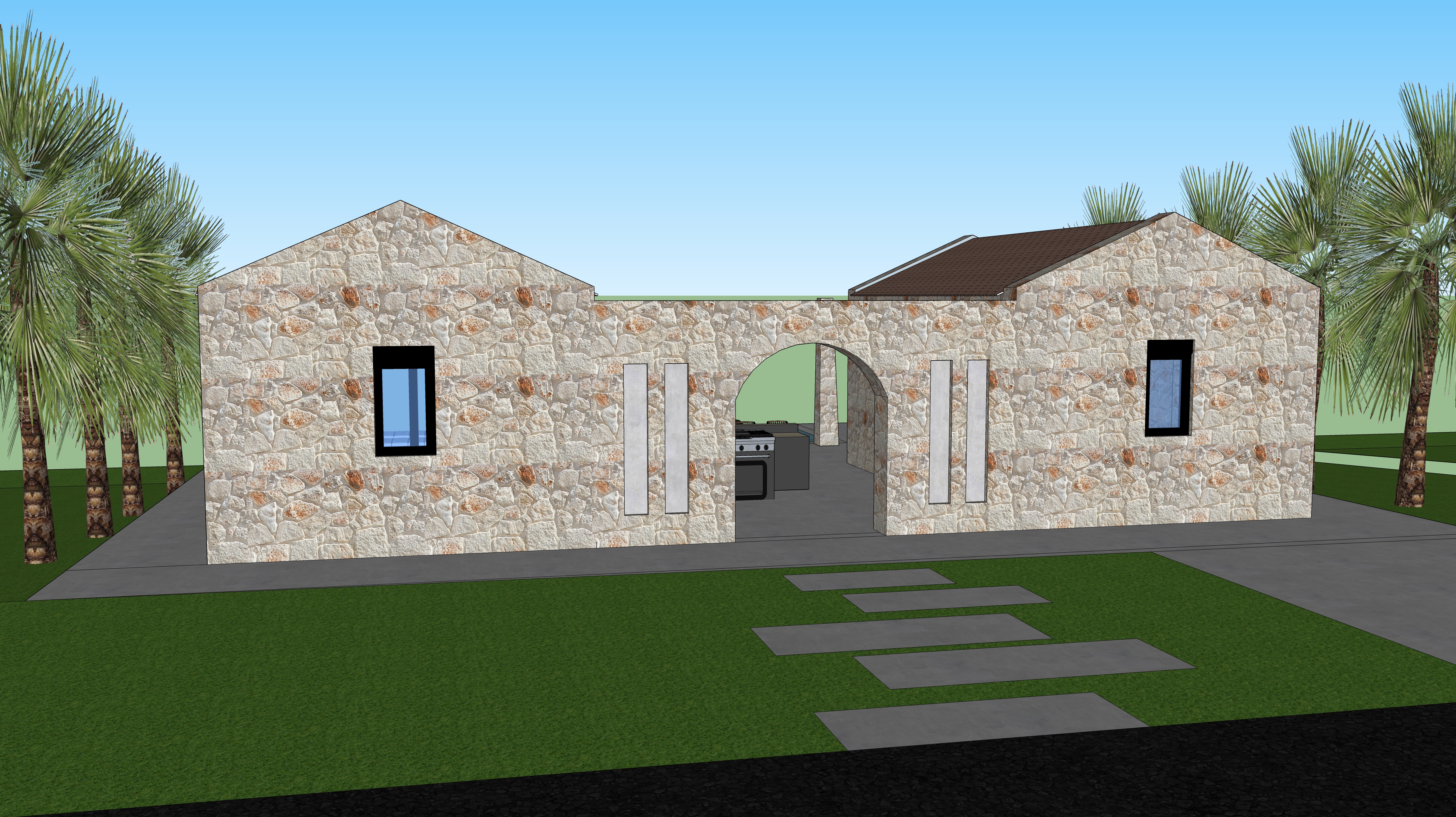 keep the stone pattern as shown in the photo add soft off white shades of micro cement on the tiles and the floor and use natural stone like in the photo for the surfaces where stone appears in front there are stone columns and a wooden pergola and even further in front there is a swimming pool add lighting on the building with various spotlights there is an olive tree area in front of the house