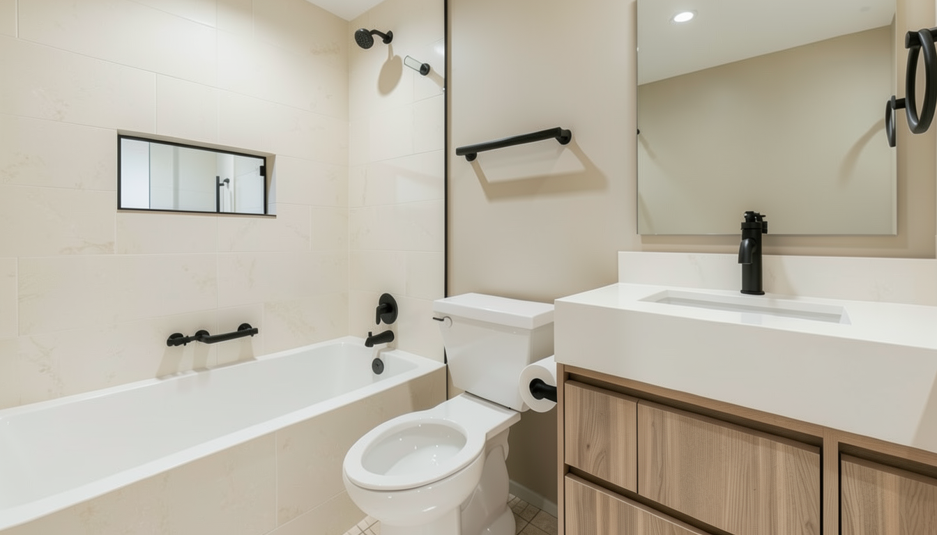 white back splash at countertop tub wall tile using ghiaia mix ivory matte tub side no tile is porcelain no grab bar at niche wall