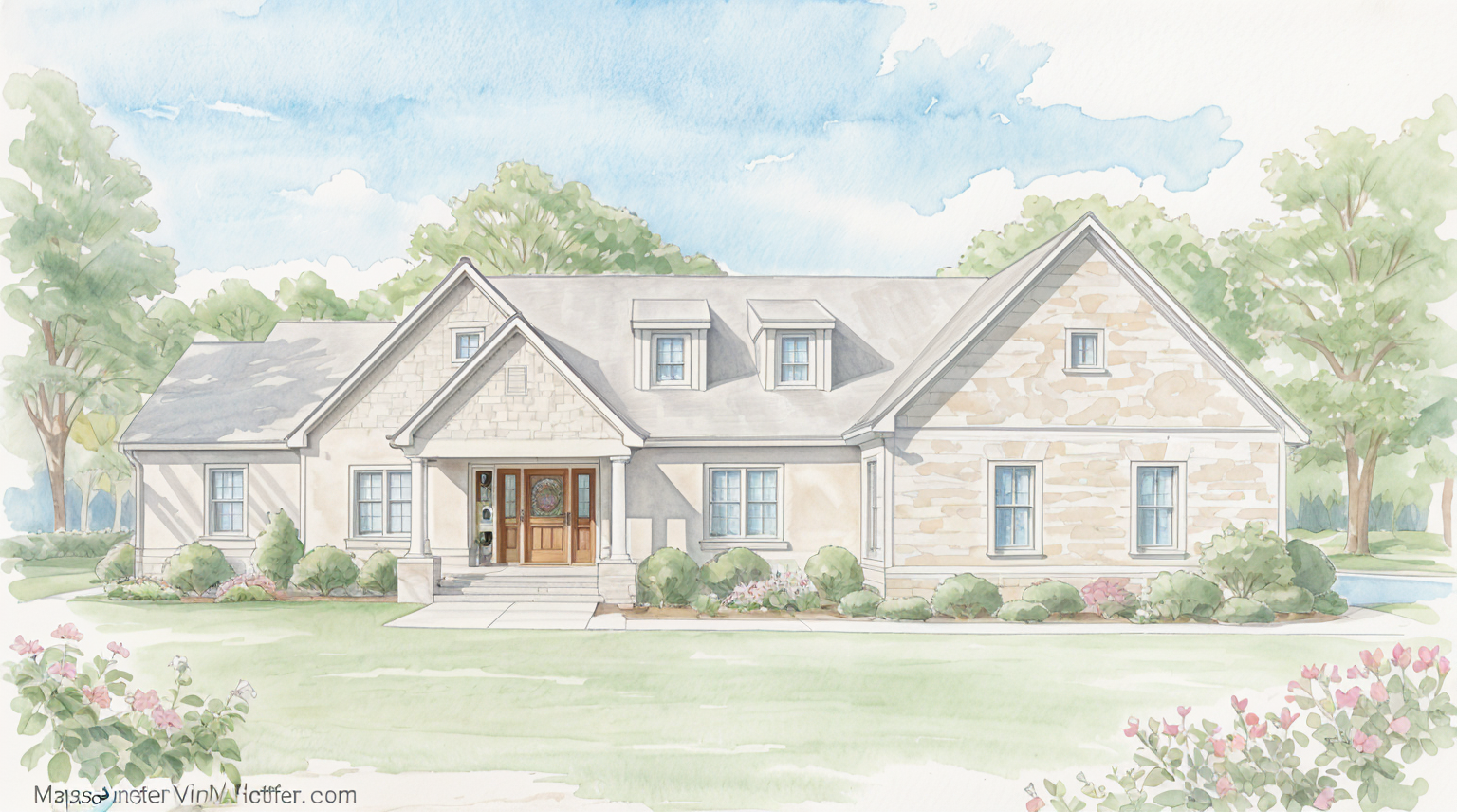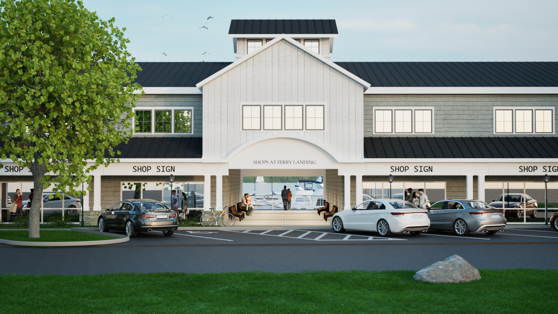 this is a new build marina clubhouse the siding is a grey shingle with a white vertical clapboard under the center gable the roof is a dark metal standing seam the sky is filled with puffy clouds