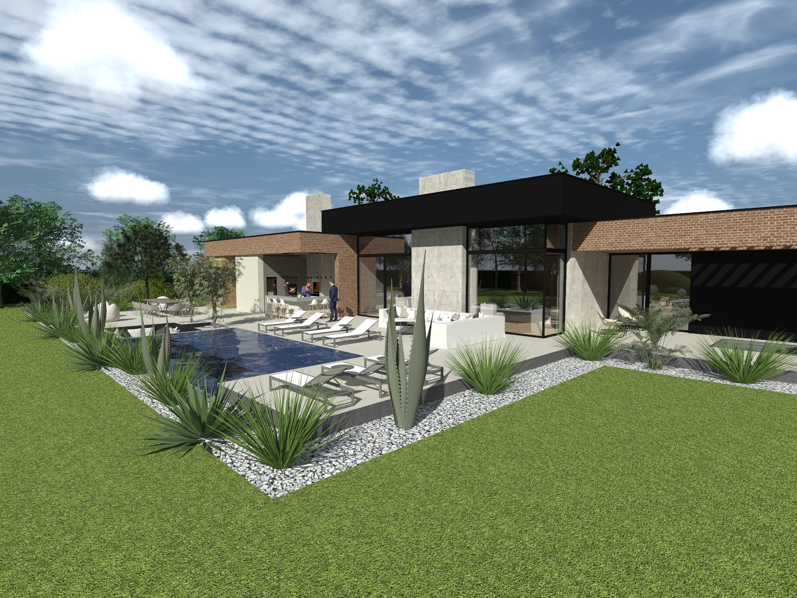 exterior shot enhance the plants enhance the trees enhance the pebbles enhance the grass enhance the brick texture enhance the fire enhance the water architecture