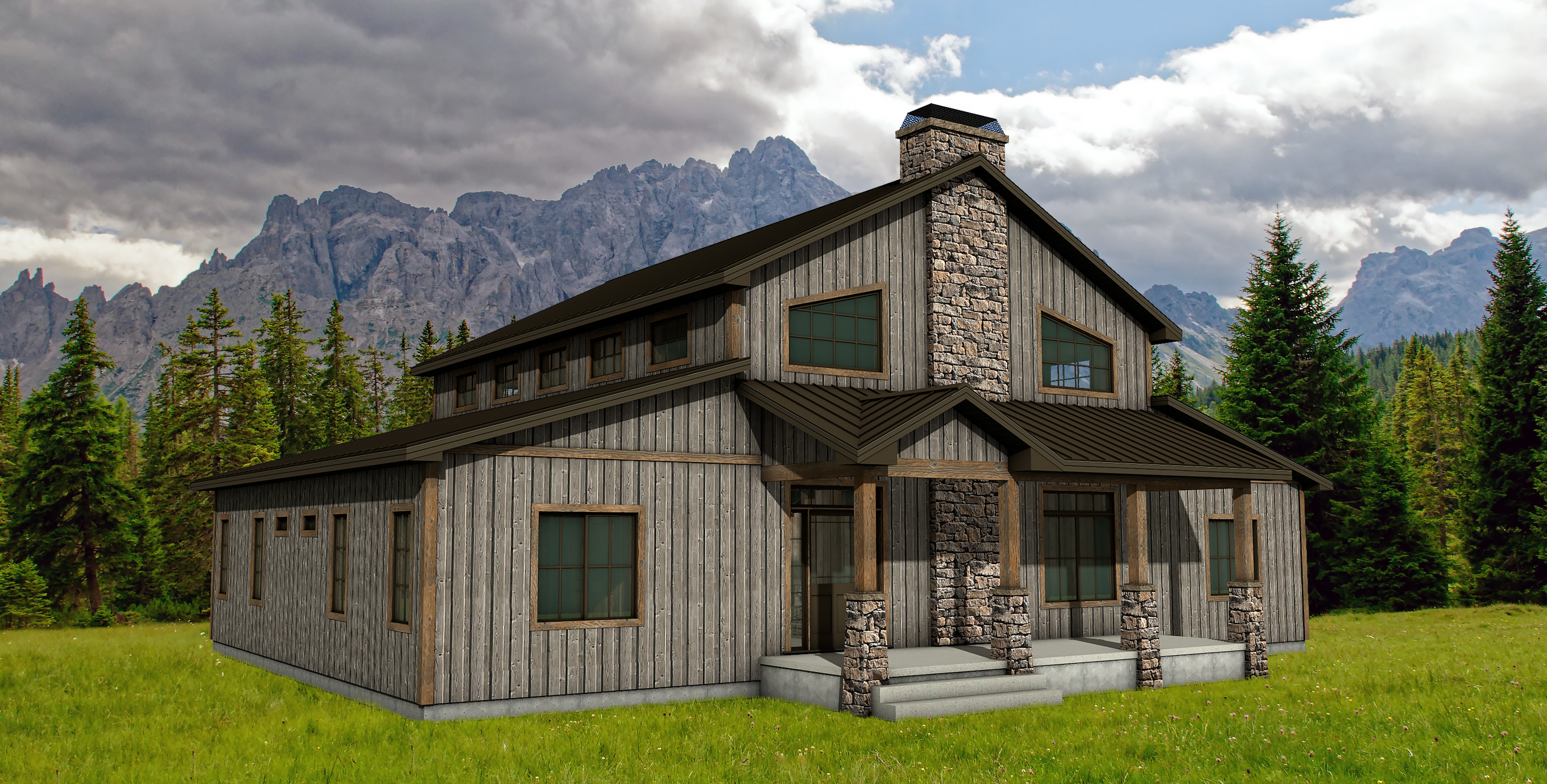 a modern house retain the exact structure and window arrangement patio columns rooflines foundation height and proportions exactly as shown in the reference image integrate into the terrain surround the property with a lush dense forest of mixed hardwoods add mid day golden sunlight subtle dappled highlights across the siding and grass create ultra realistic lighting crisp shadows detailed textures in the siding and glass reflections and an overcast sky render in hyper realistic architectural visualization quality 8k resolution set the house back a little more with more space on sides top and bottom