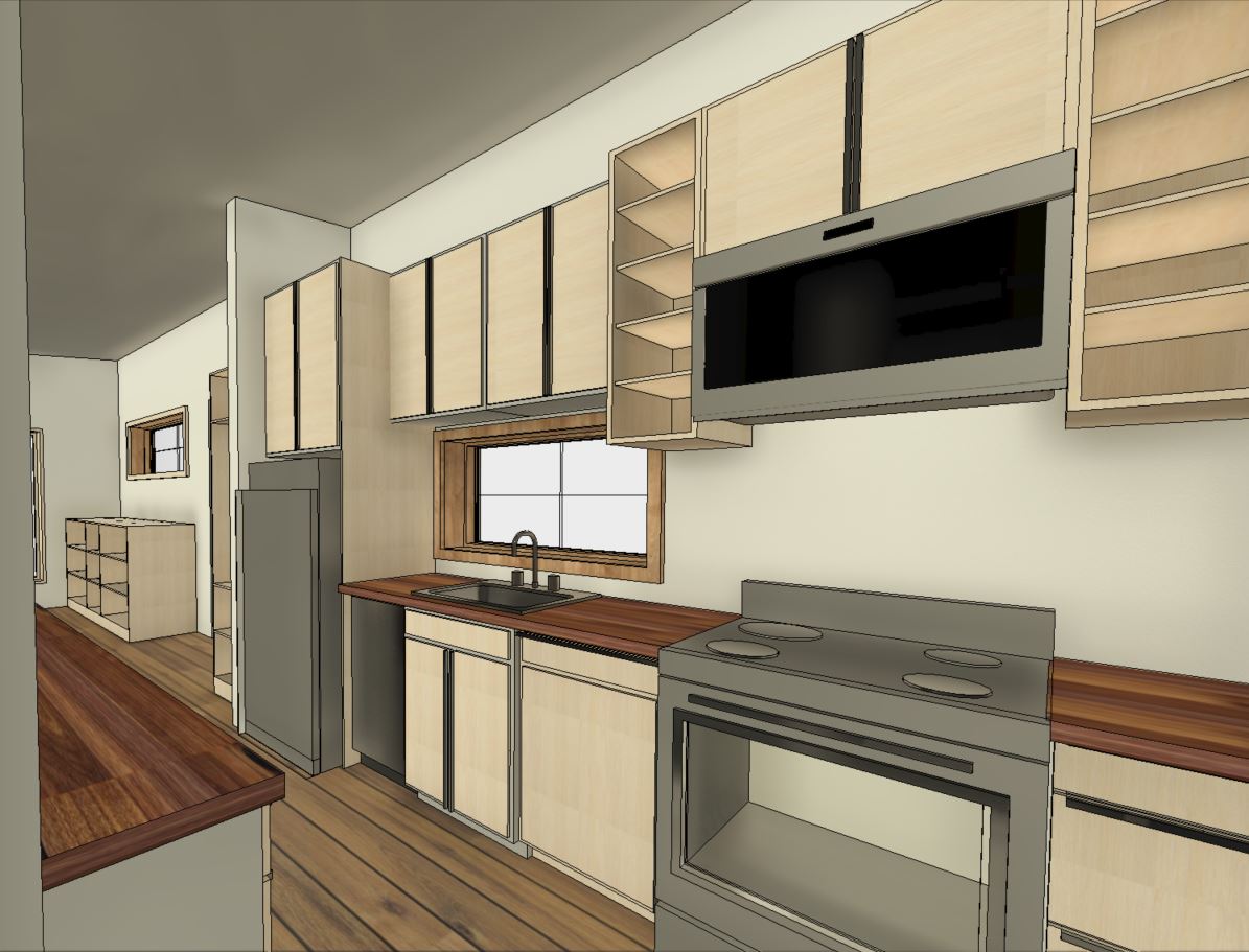 realistic interior perspective shot of a light wood kitchen stainless steel appliances dark stained butcher block countertops light colored walls light wood casework and nice hardwood floors