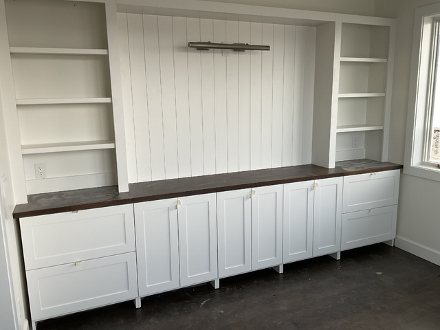 do not change the cabinets in any way preserve the exact cabinet colors materials finishes dimensions door and drawer styles hardware spacing alignment and all geometry exactly as shown do not alter the countertop shape backsplash appliances flooring lighting fixtures or wall structure only remove the construction materials clutter and mess from the scene clean the room and make it look finished and staged add a few simple tasteful home accessories appropriate for the style of the space but do not add or remove any furniture windows or architectural elements maintain the original lighting direction and realism enhance clarity and polish the photo while keeping the cabinetry and room design completely unchanged do not alter the lighting to keep the cabinet colors as they are in the image add carpet turn the light on put a framed picture below it stage the countertop and open shelves for an office put a simple view out the window