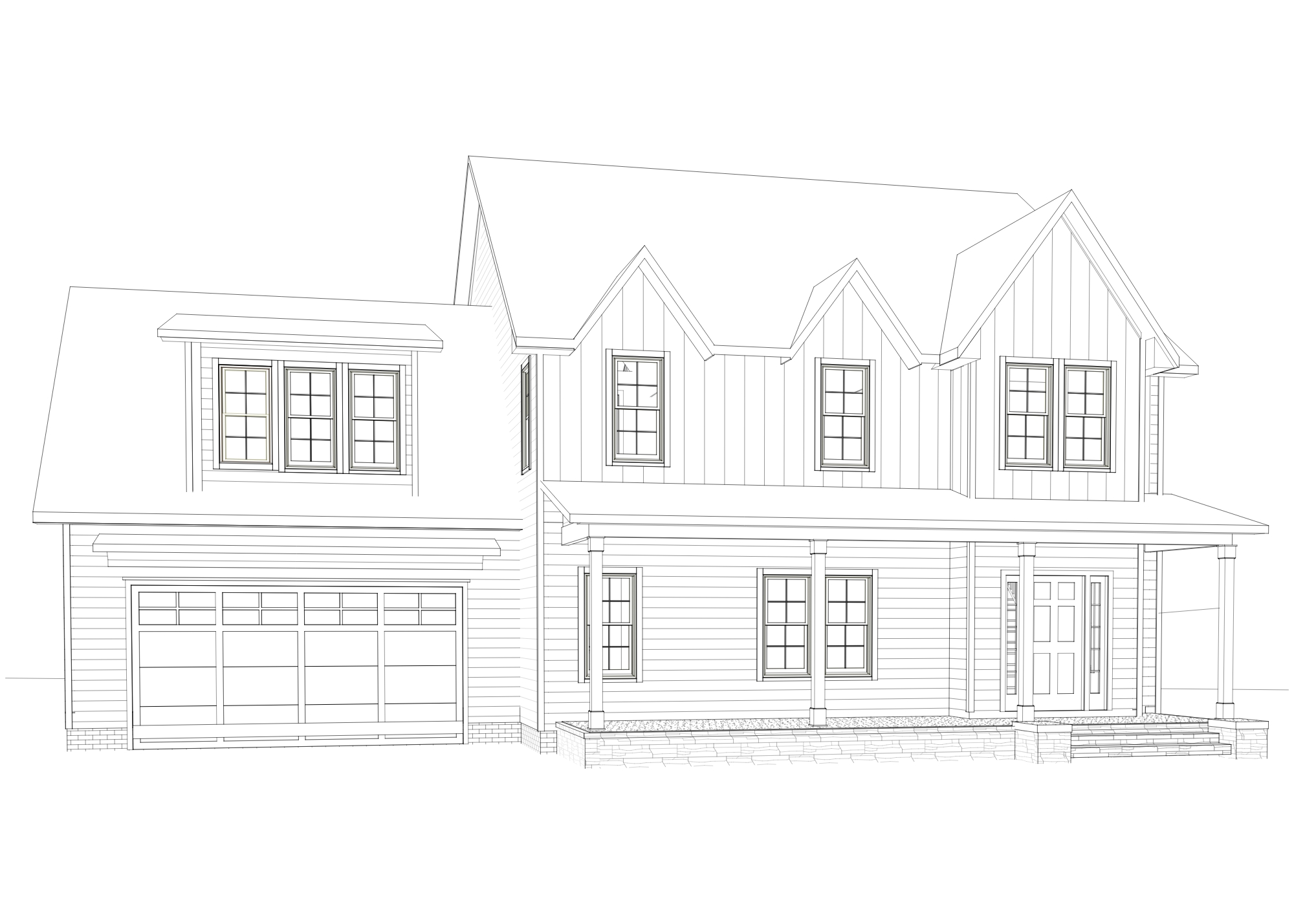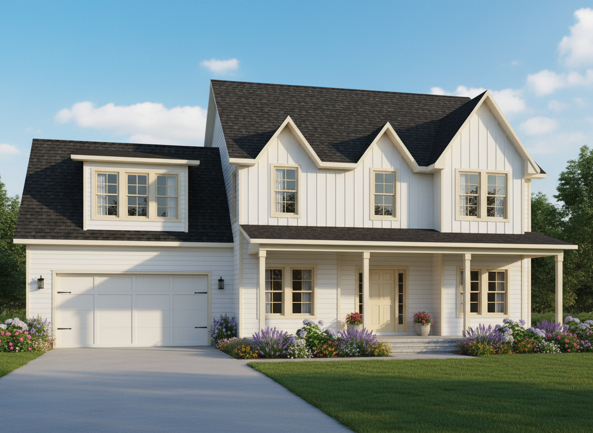 render this with white vinyl siding and a black shingle roof the garage door and porch columns and white architecture